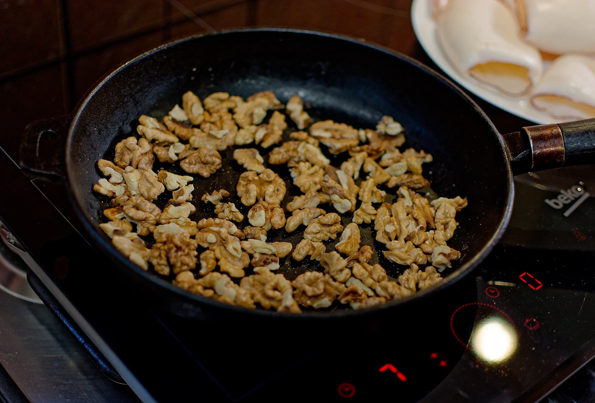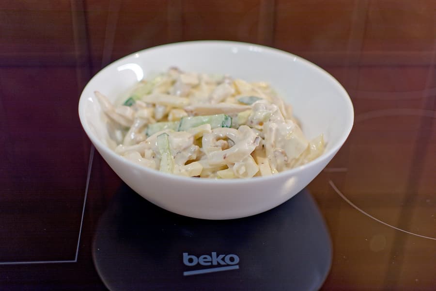 Дальше мы почистили яйца, нарезали соломкой их и кальмары, яблоко, огурец и корень сельдерея, а также нарезанные грецкие орехи, которые предварительно обжарили на одном из малых режимов.