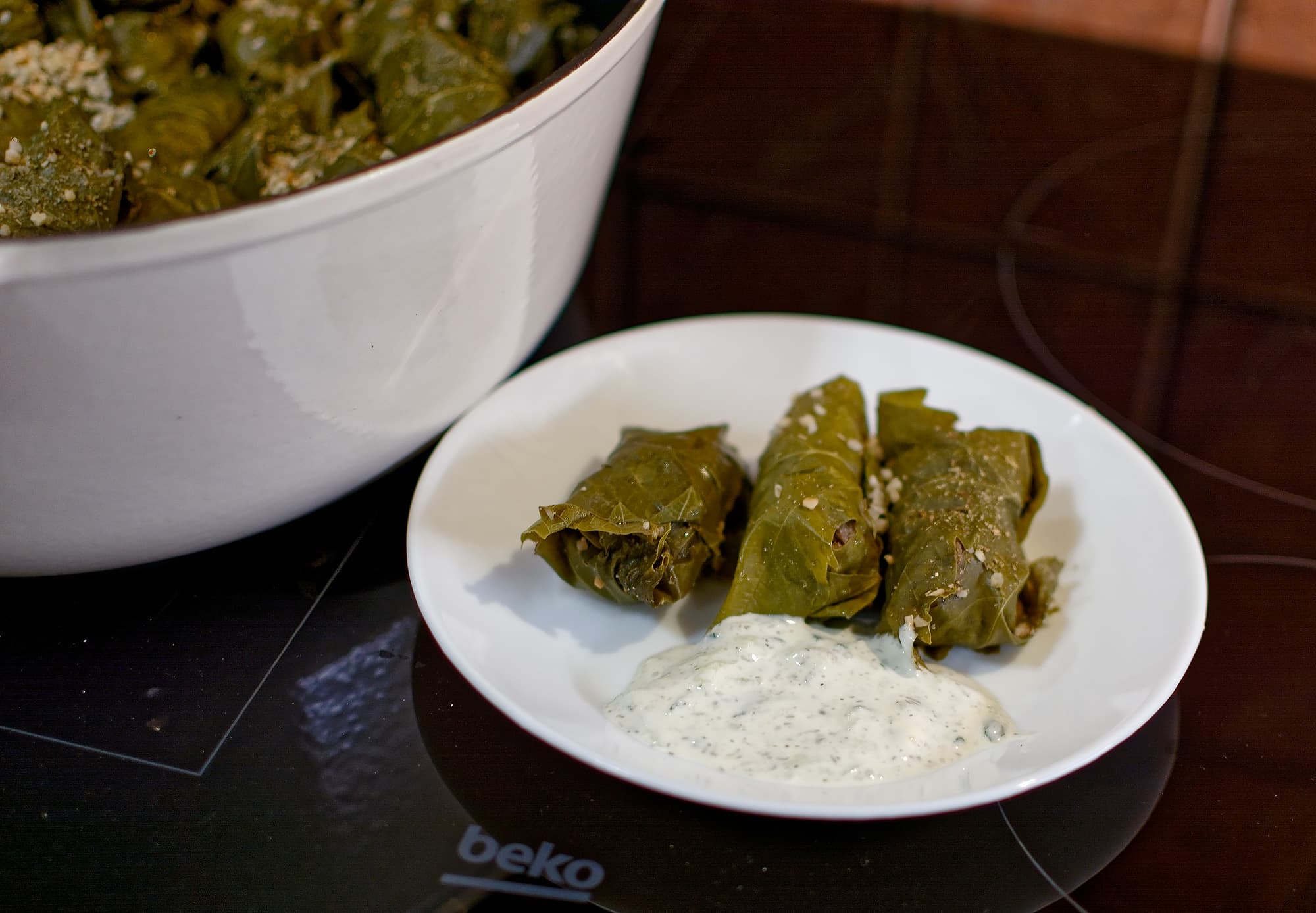 Через сорок минут наша долма прекрасно протушилась: нежная, сочная, ни одна штучка не развалилась и не порвалась, и очень вкусно. Подавали с соусом дзадзыки (йогурт-чеснок-тертый свежий огурец-пряные травы).