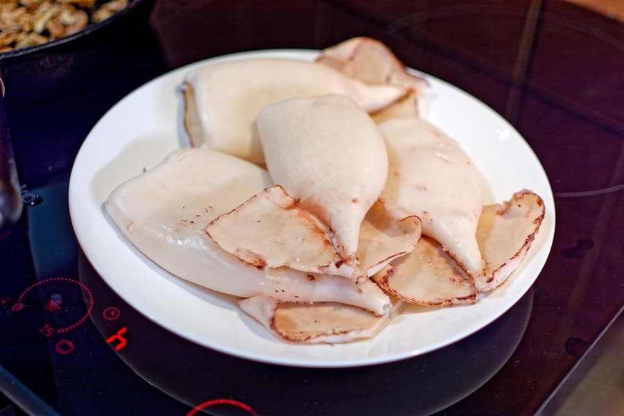 Мы взяли несколько замороженных тушек кальмаров. Работать с ними было очень удобно: boost мгновенно нагревает воду, остается только отрегулировать нагрев, посолить и еще за минуту-две дождаться готовности.