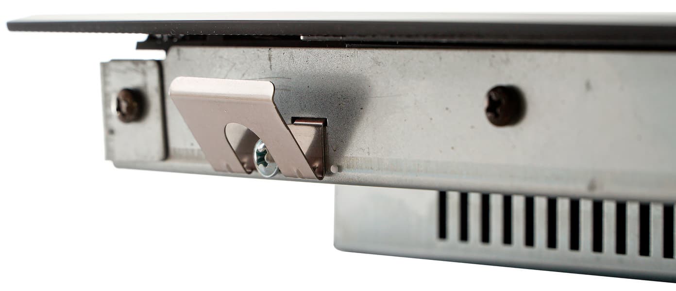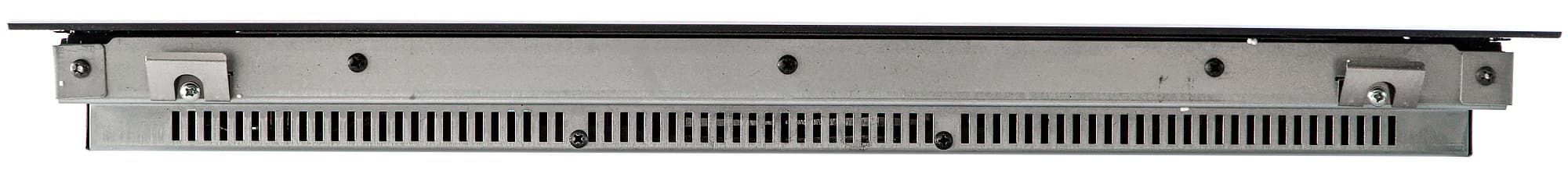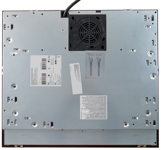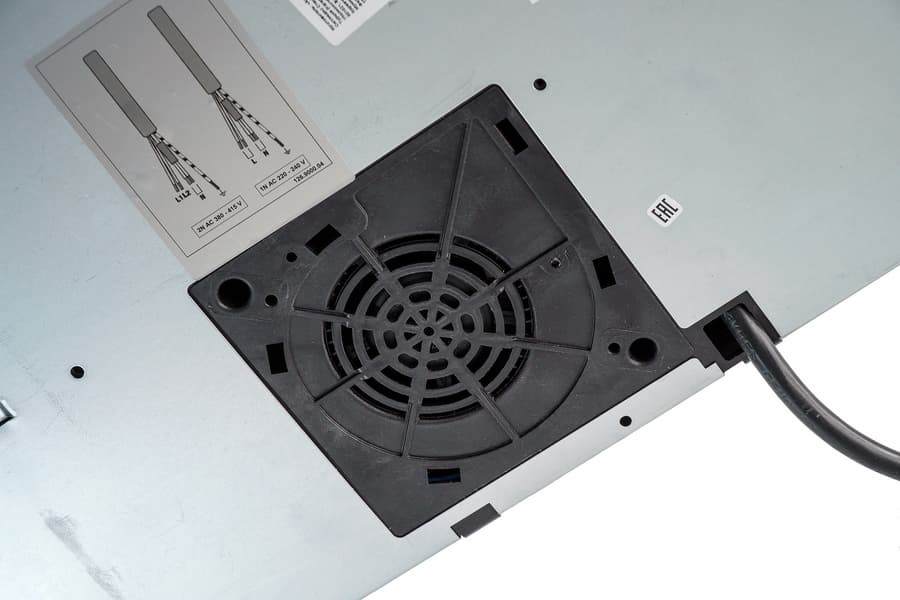 Кожух с нижней стороны поверхности — из оцинкованного железа, да и вообще, судя по весу (почти 12 кг) железа здесь не жалели ни снаружи, ни внутри. По ощущениям от установки, это самая тяжелая индукционная варочная панель из всех, что попадали к нам в руки. А вот охлаждающий вентилятор всего один и довольно скромного размера.