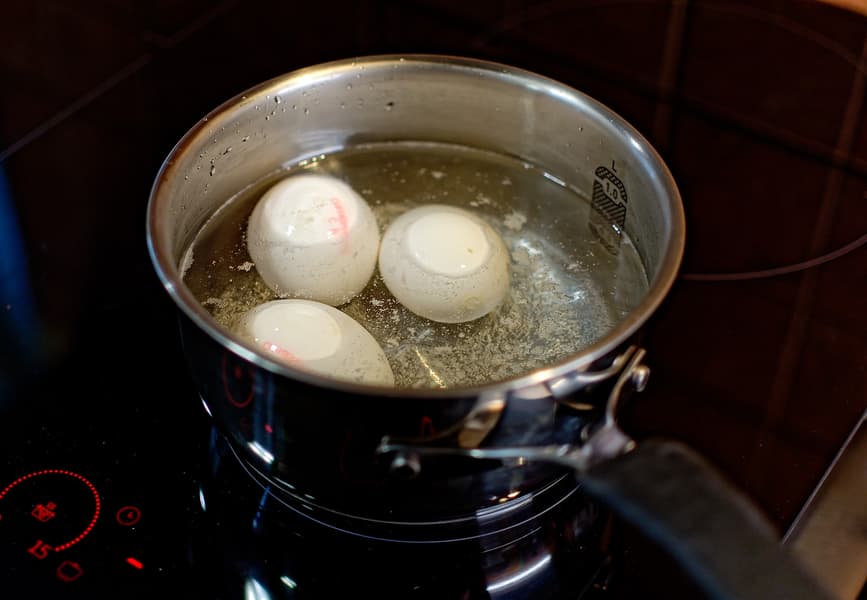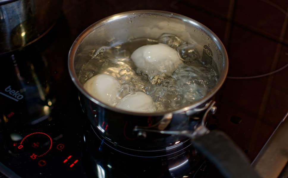 Также отварили яйца. На этом этапе отметили, что все-таки иногда к процессу нужно подходить с повышенной внимательностью: все же у нас тест индукционной плиты, а не скатерти-самобранки. Увлекшись бустером, мы вскипятили яйца за несколько секунд, вызвав обильное разбрызгивание.