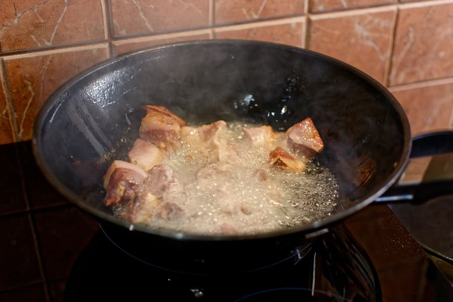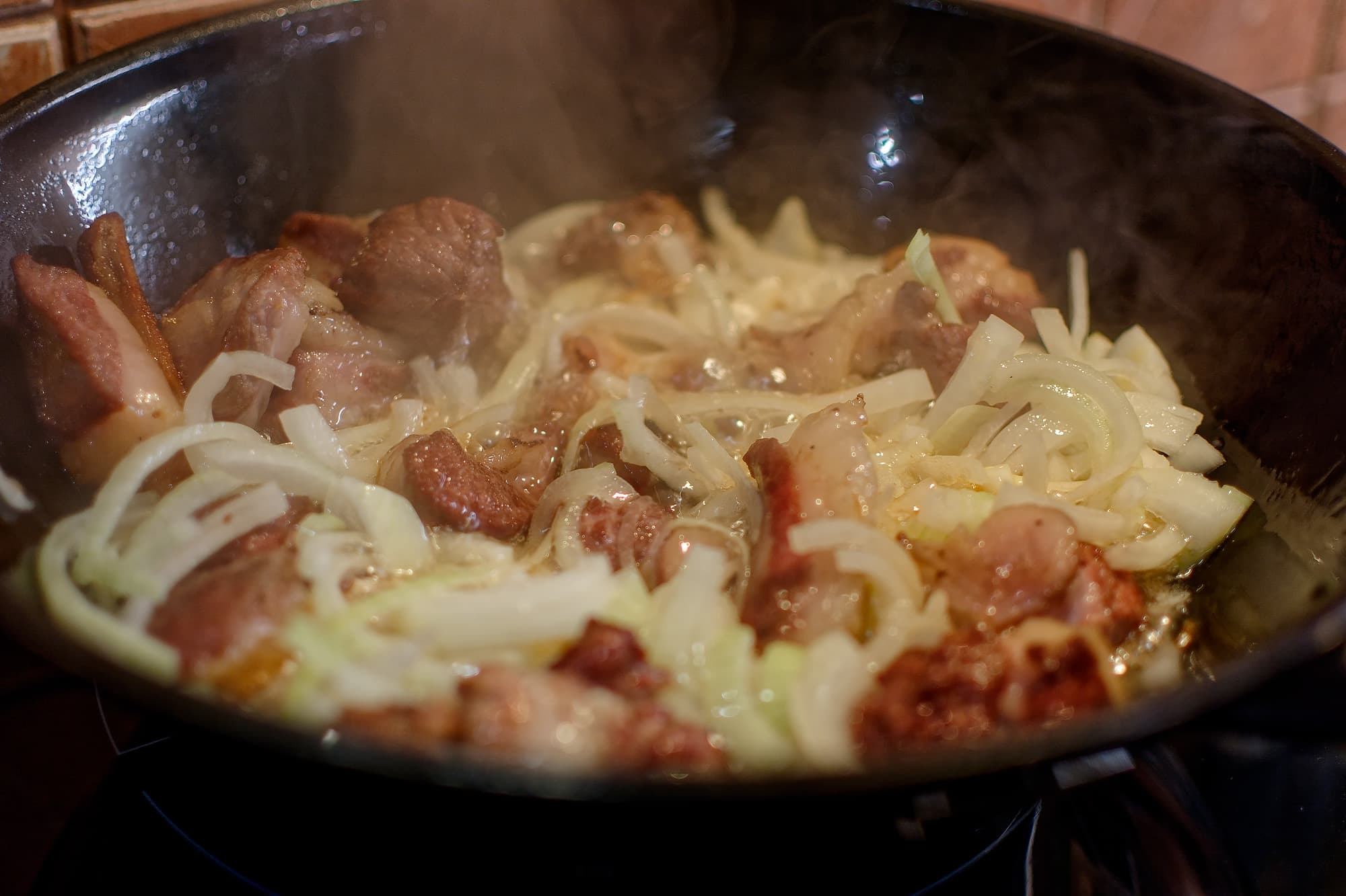 Готовить плов будем в воке, формой напоминающем полказана. Нагрели немного рафинированного кунжутного масла в воке на режиме бустера на самой мощной конфорке. Начинаем забрасывать мясо.