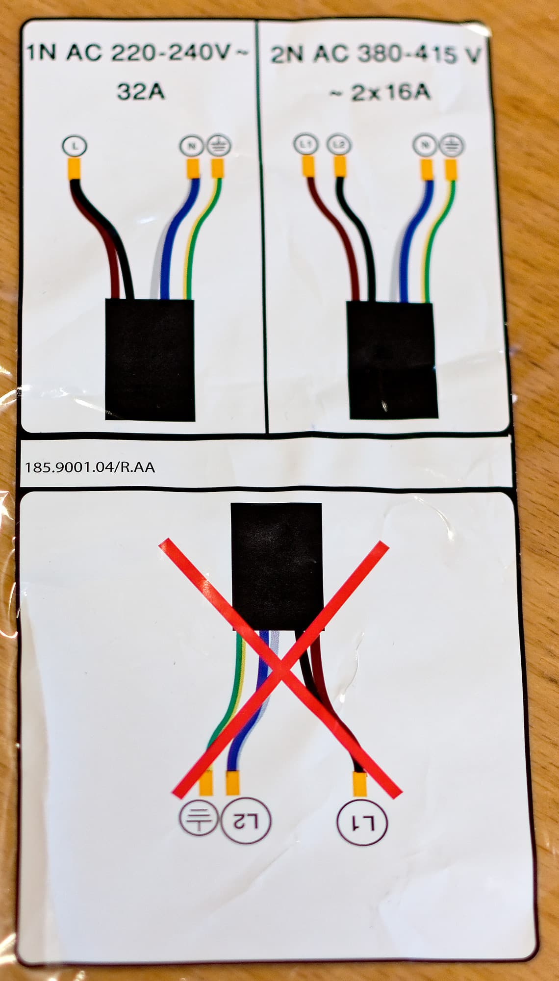 Варочная панель рассчитана на два варианта электросети: однофазную 220—240 вольт или двухфазную 380—415 вольт. Приведенная в инструкции схема позволяет понять, каким образом должны подсоединяться провода. В нашем случае использовалась однофазная сеть 230 вольт.