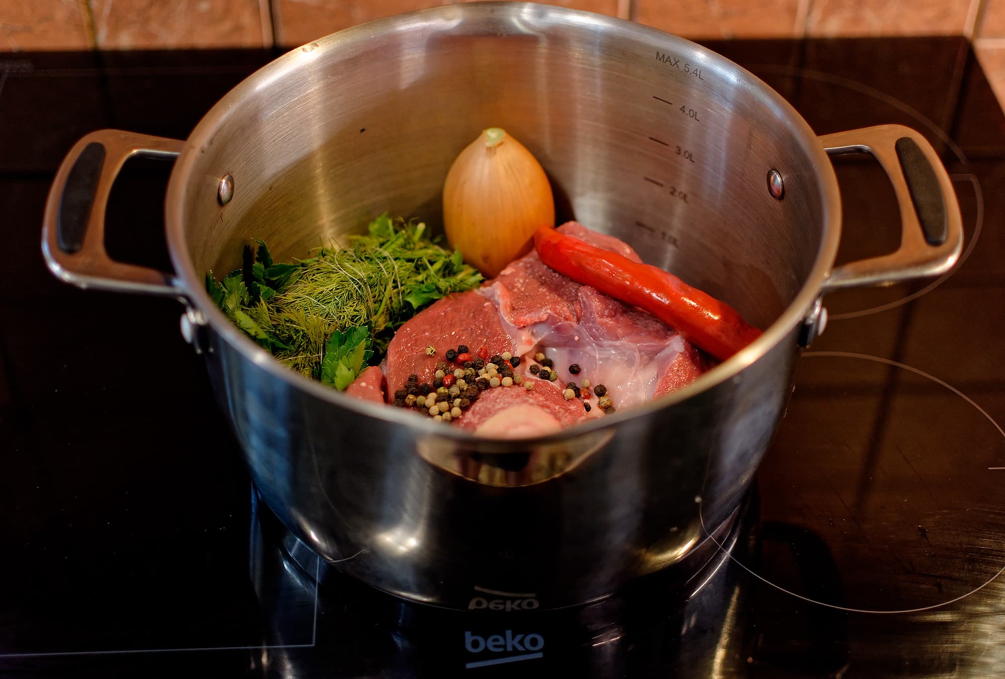 Залили водой, режим boost. За считанные минуты вода нагрелась, но не закипела, после чего мы отрегулировали мощность таким образом, чтобы наш бульон изредка слегка побулькивал. Варили около 2,5 часов. Все удалось, чему немало способствовал весьма малый ход мощности «малых» режимов.