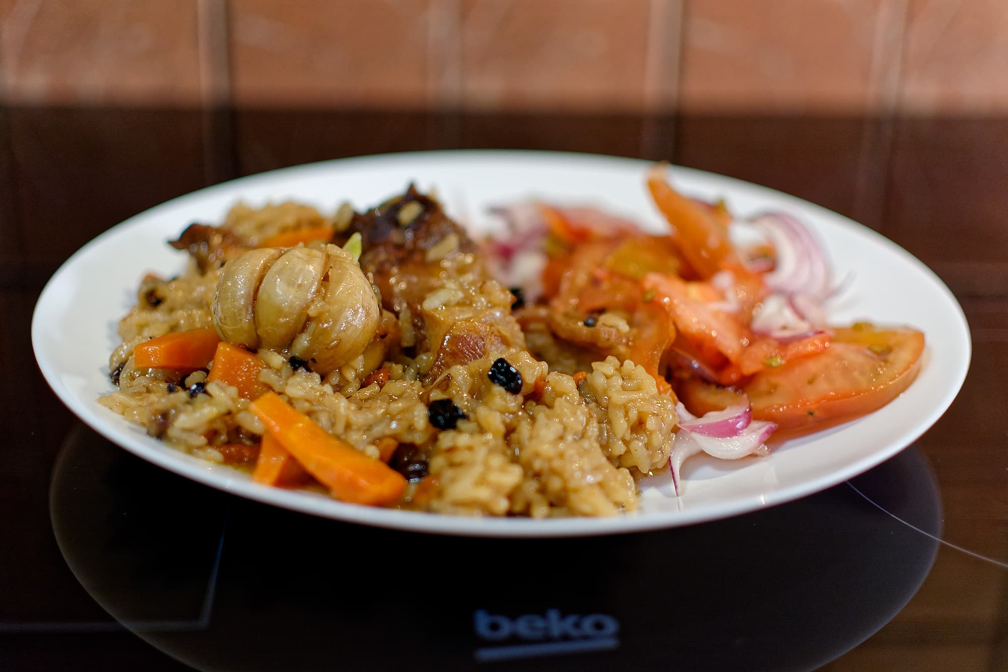 Нам понадобится: баранина (у нас было граммов 700 мякоти задней ноги с жирком), по 2-3 луковицы и морковки, полкило риса, барбарис, зира, красный перец, чеснок, ягоды годжи и соль.