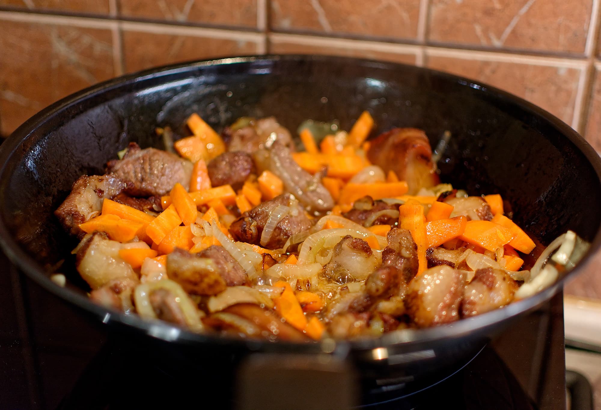 О, да! То, что надо: корочка мгновенно схватывается, мощности хватает, чтобы мясо не давало сок. Нагрев идет снизу, так что уже обжаренные партии двигаем повыше по бортикам, а на дно кидаем новую баранину.
