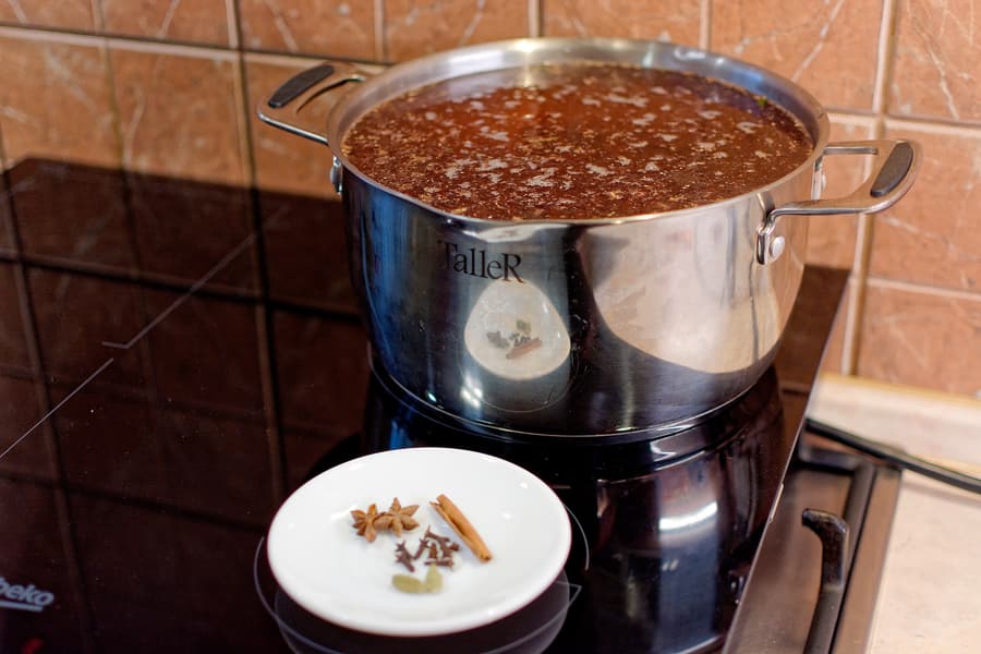 На этот раз мы взяли замороженные ягоды: черную смородину, наполнили ими около пятой части объема огромной шестилитровой кастрюли, добавили немного сахара, гвоздики, корицы, бадьяна и кардамона, залили водой и поставили на большую конфорку, включив режим boost.