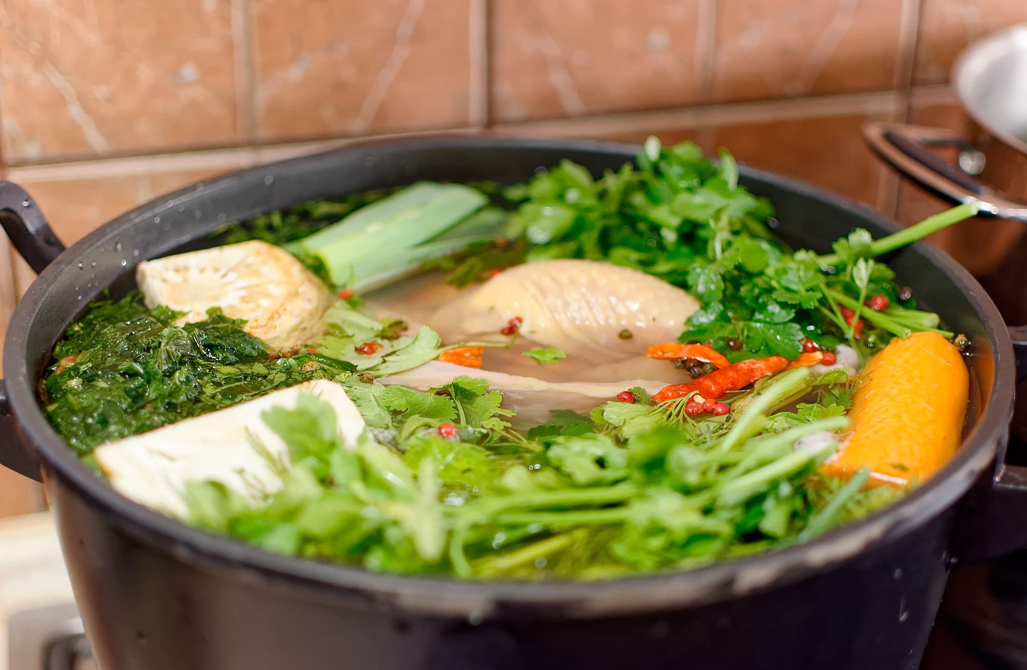 Это дополнительный тест: мы планировали сварить бульон из курицы. Курицу, много зелени, две луковицы в шелухе, морковку, корень сельдерея, зеленую часть порея, перец стручковый и горошком и соль поместили в большую кастрюлю, залили водой.