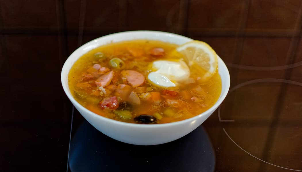 Солянка вышла великолепной. Подавали со сметаной и лимоном.