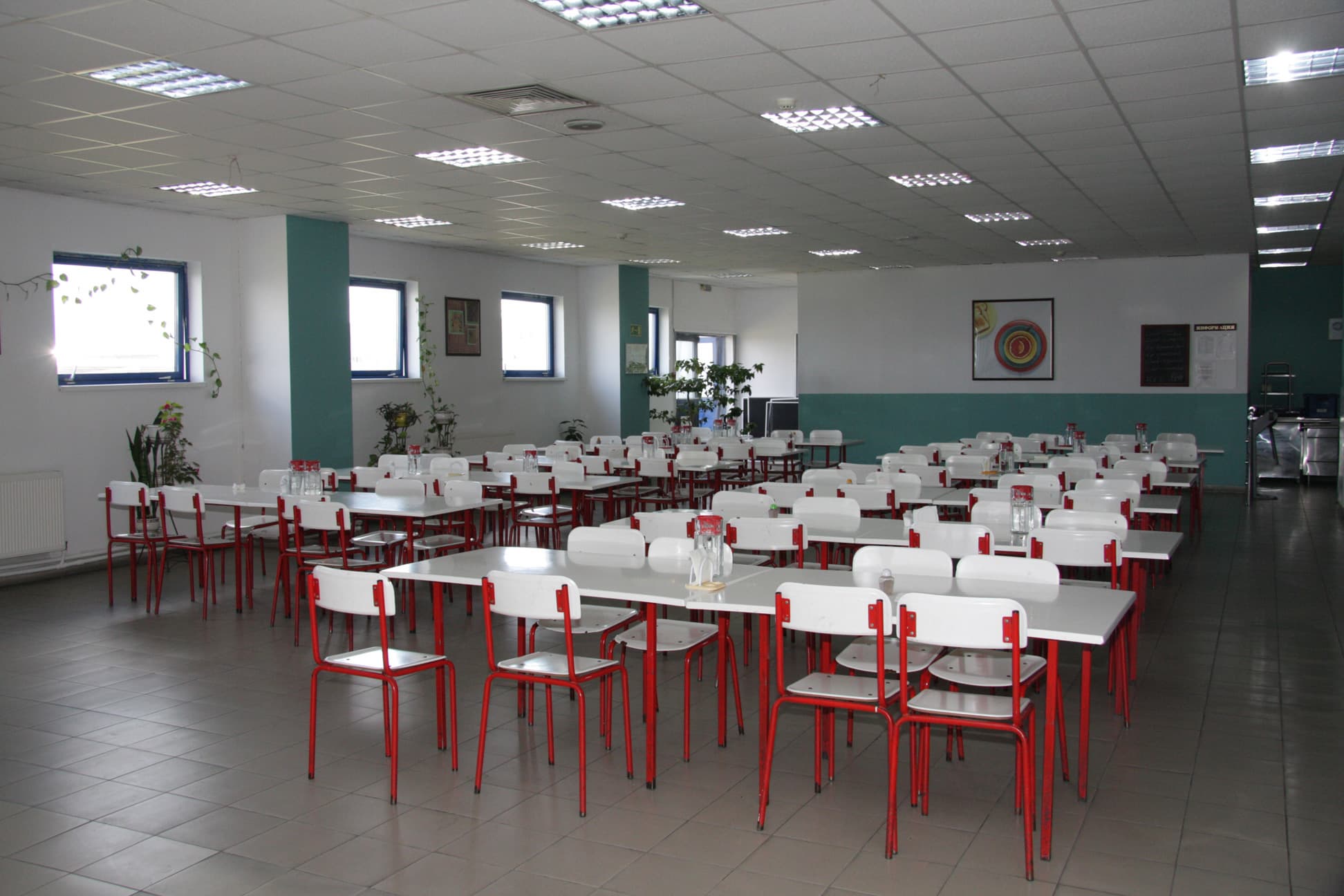Столовая, в которой бесплатно кормят сотрудников завода, чистая и светлая.