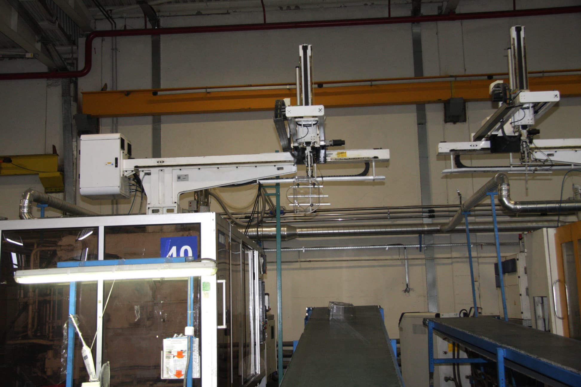 Далее готовые детали подхватываются манипуляторами и перекладываются на транспортную ленту.