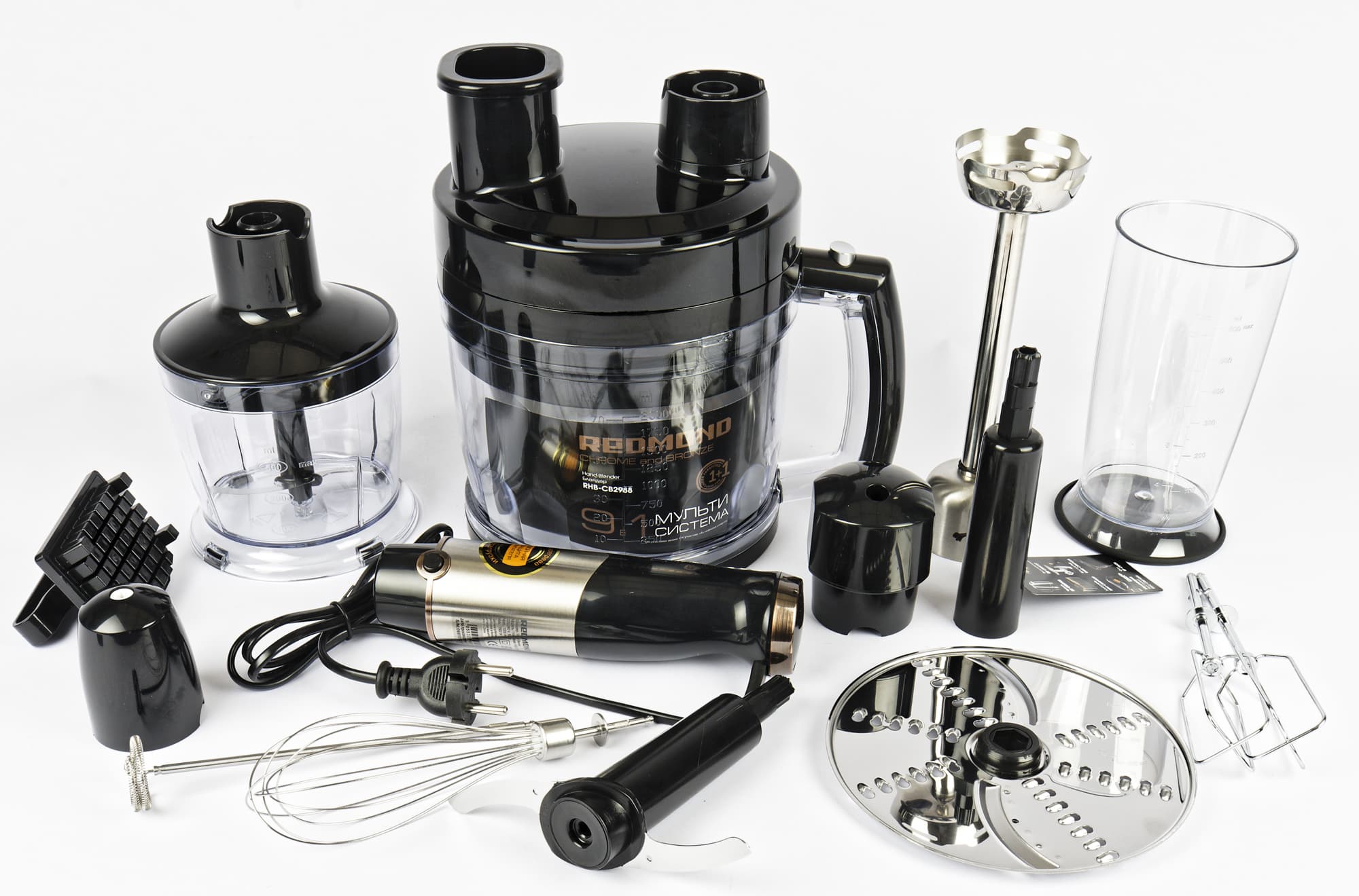 | Redmond RHB-CB2988 | погружной блендер, венчик, насадка с двумя венчиками, вспениватель молока, насадка для нарезки кубиками, терка/шинковка, нож для измельчителя малый, нож для измельчителя большой | номинальная — 1000 Вт, максимальная — 1500 Вт | плавная регулировка скорости |