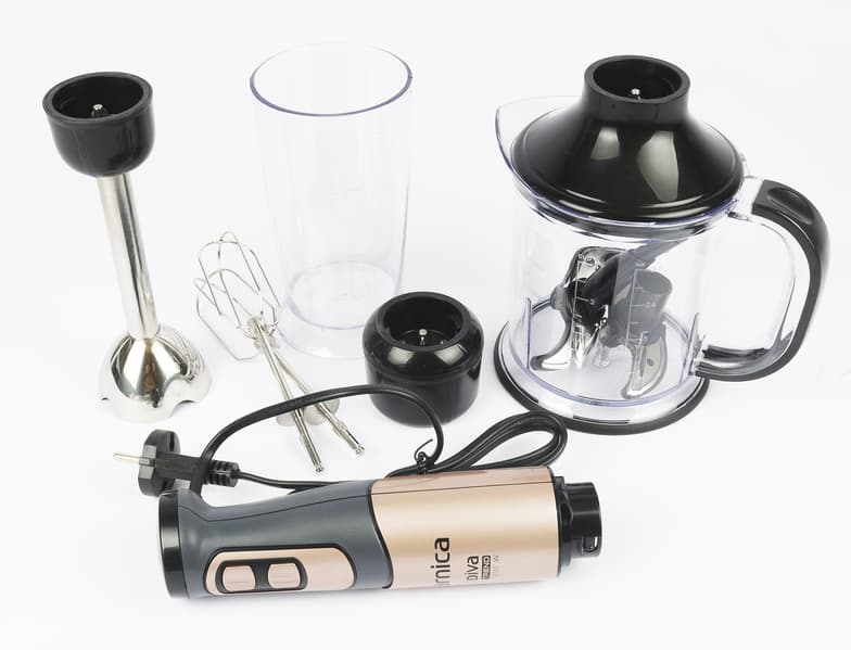 Данная модель — практически классический блендер «3 в 1», за исключением того, что тут у нас нет венчика для взбивания, зато есть две насадки для работы в качестве миксера.