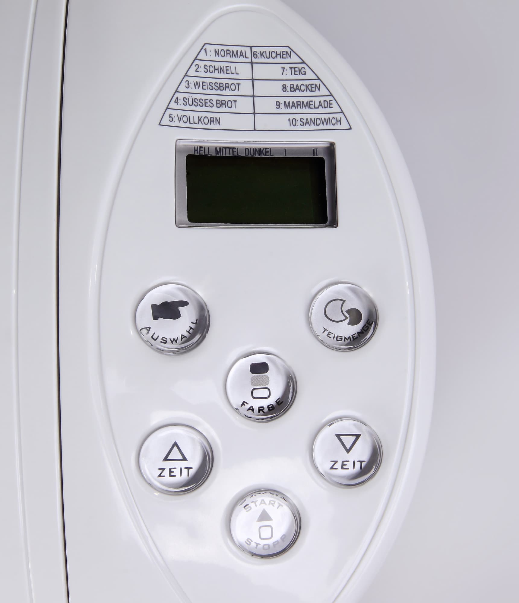 Следующий элемент дискомфорта внесли лопасти для замеса теста, упорно остающиеся в буханке, несмотря на обильное смазывание их маслом при закладке ингредиентов. Если не овладеть искусством их извлечения с помощью крючка или попросту забыть о них, то есть риск повредить антипригарное покрытие при нарезке хлеба. Кнопки и программы на корпусе имеют немецкие названия, поэтому не владеющие иностранным языком пользователи будут вынуждены просто запоминать, что чему соответствует.