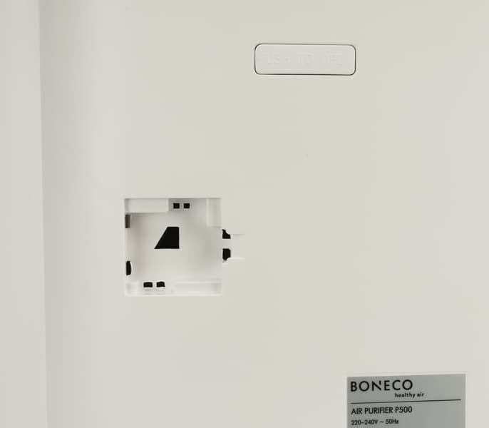 В левом нижнем углу задней панели располагается двухконтактная розетка для подключения электропровода. В центре расположен небольшой шильдик с обязательными техническими характеристиками изделия. Чуть выше отведено место для контейнера с ароматическим веществом и отсека для датчика качества воздуха.