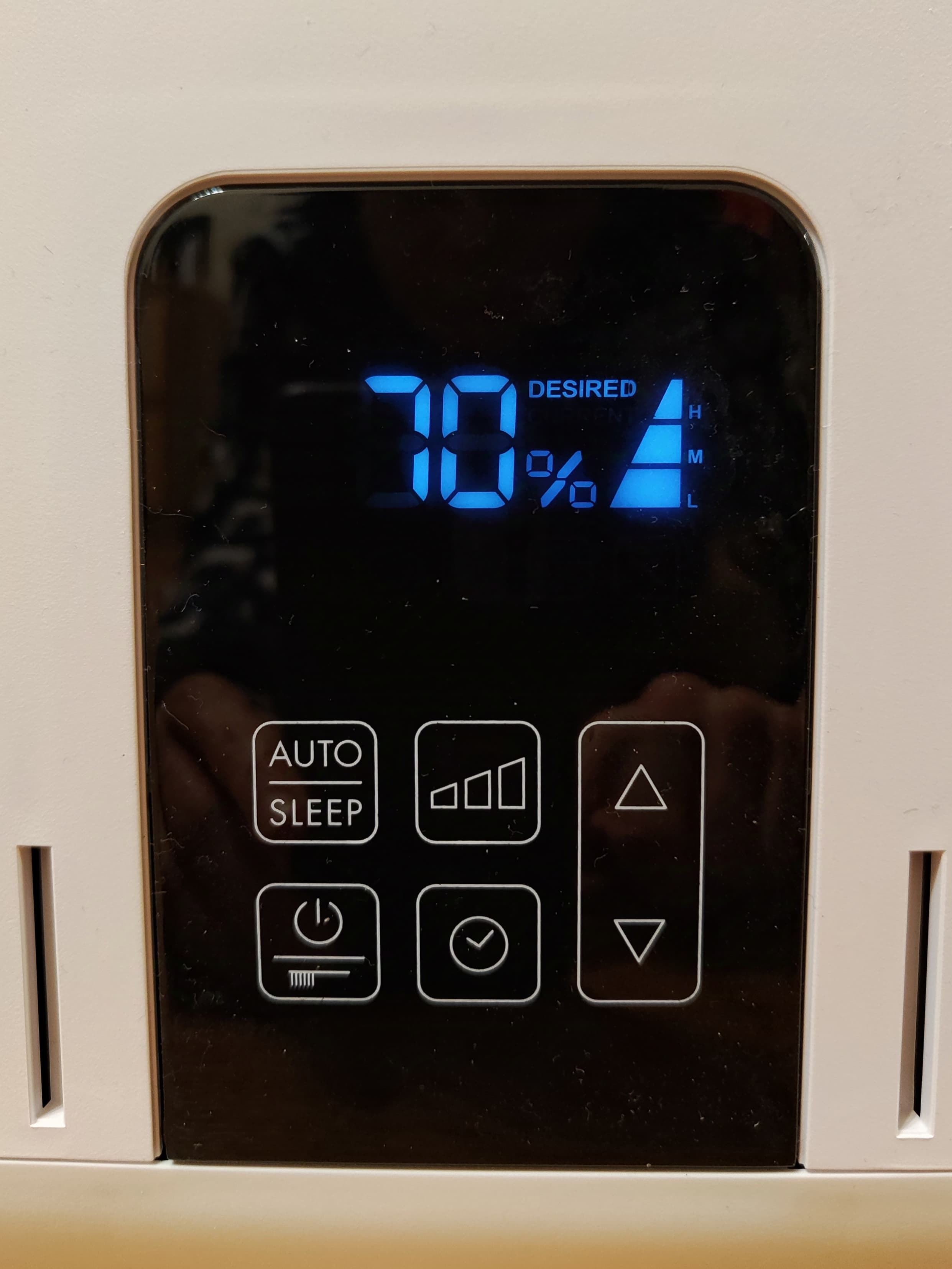 - Auto/Sleep — переключает соответствующие режимы. При включении запускается автоматический режим, в котором уровень относительной влажности устанавливается на 50%. Уровень мощности, необходимой для наиболее быстрого достижения заданной влажности прибор выбирает автоматически. В режиме Sleep или Econ, как он называется в инструкции, оптимальный уровень влажности установлен на 45%. Мощность работы, чтобы максимально быстро достигнуть целевого показателя, увлажнитель выбирает самостоятельно.
