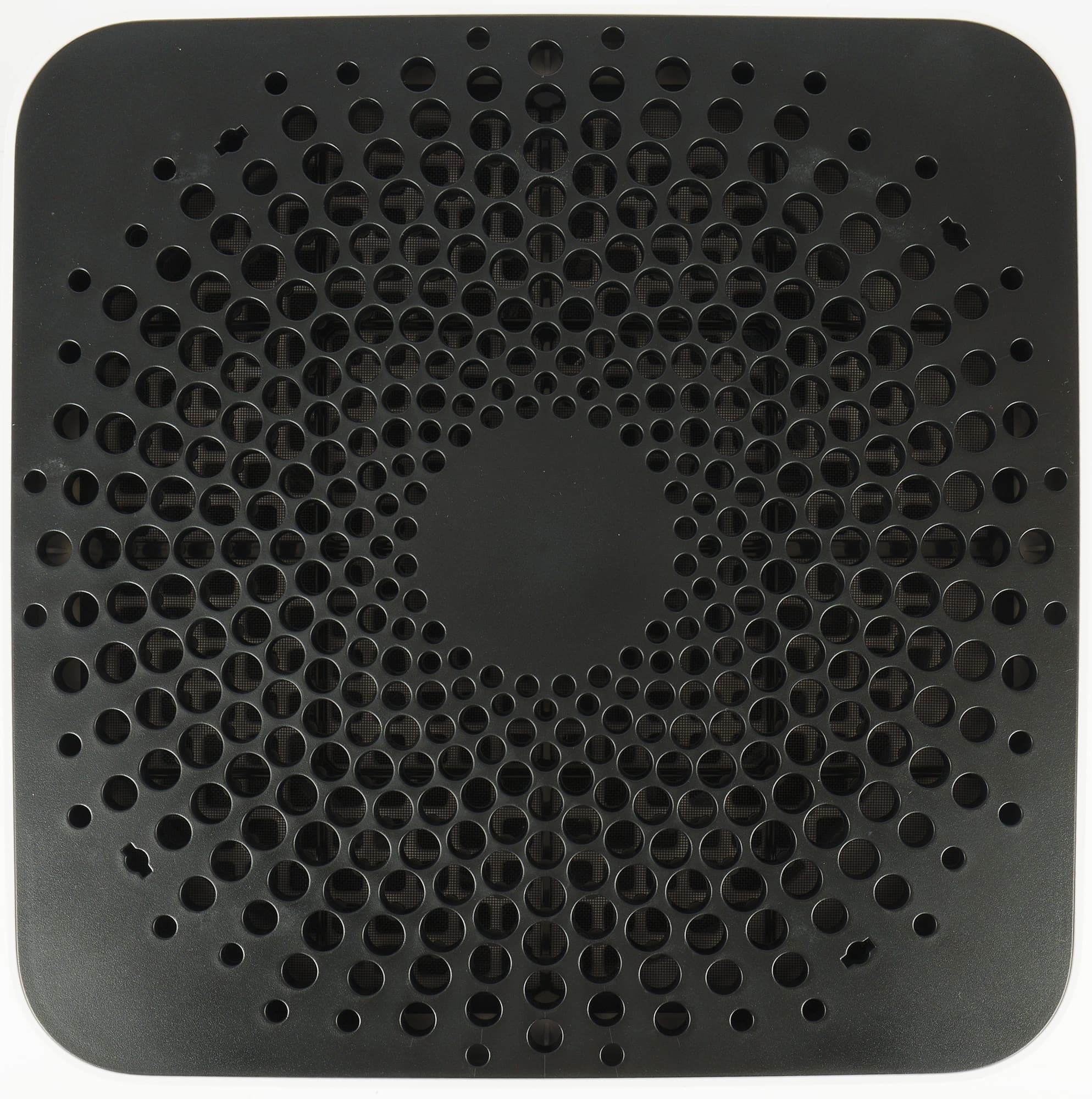 Верхняя вентиляционная решетка, через которую воздух попадает внутрь устройства, съемная. Чтобы ее открыть, следует поочередно нажать на боковые стороны пластикового квадрата: под ними размещены четыре защелки.