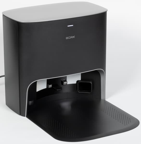 Поток воздуха с пылью и мусором покидает контейнер и направляется в одноразовый пакет, установленный в отсеке станции. Посадочное место под него оборудовано специальным датчиком, и без мешка функция самоочистки не включится.