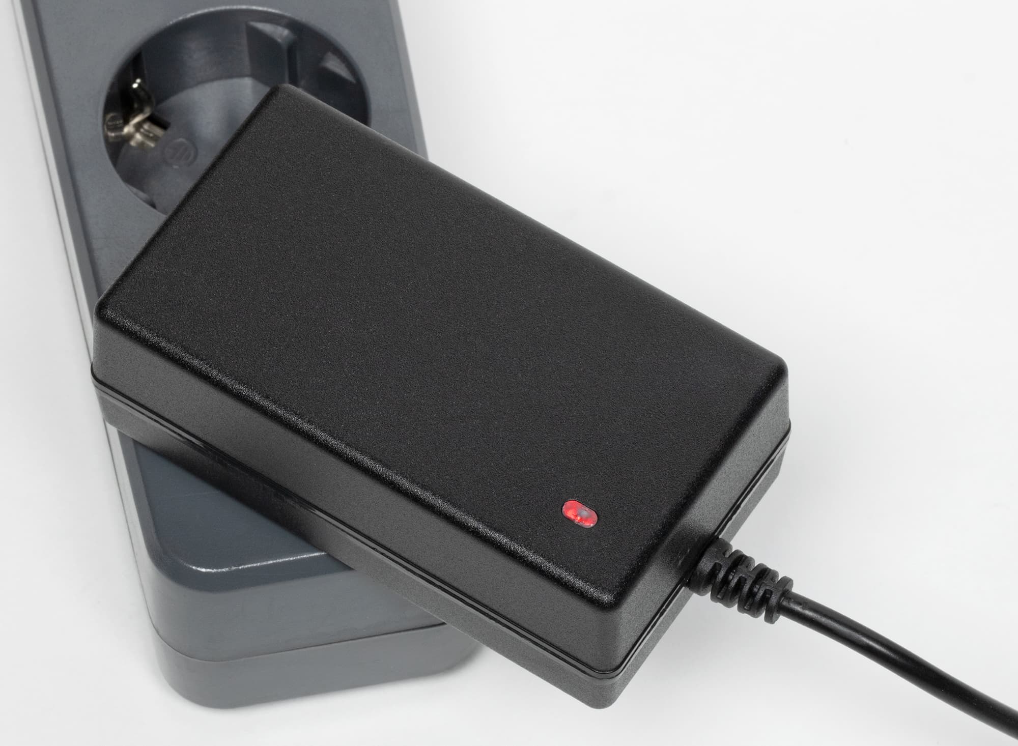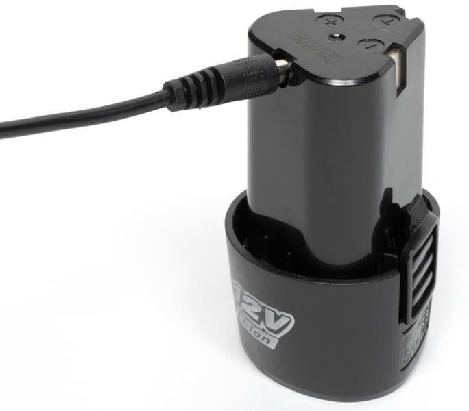 Прилагаемое зарядное устройство — это обычный сетевой адаптер с кабелем и штекером на конце. Штекер вставляется в гнездо, которое находится в корпусе батареи. Во время зарядки светодиод адаптера светится красным цветом, а по завершении зарядки цвет меняется на зеленый.