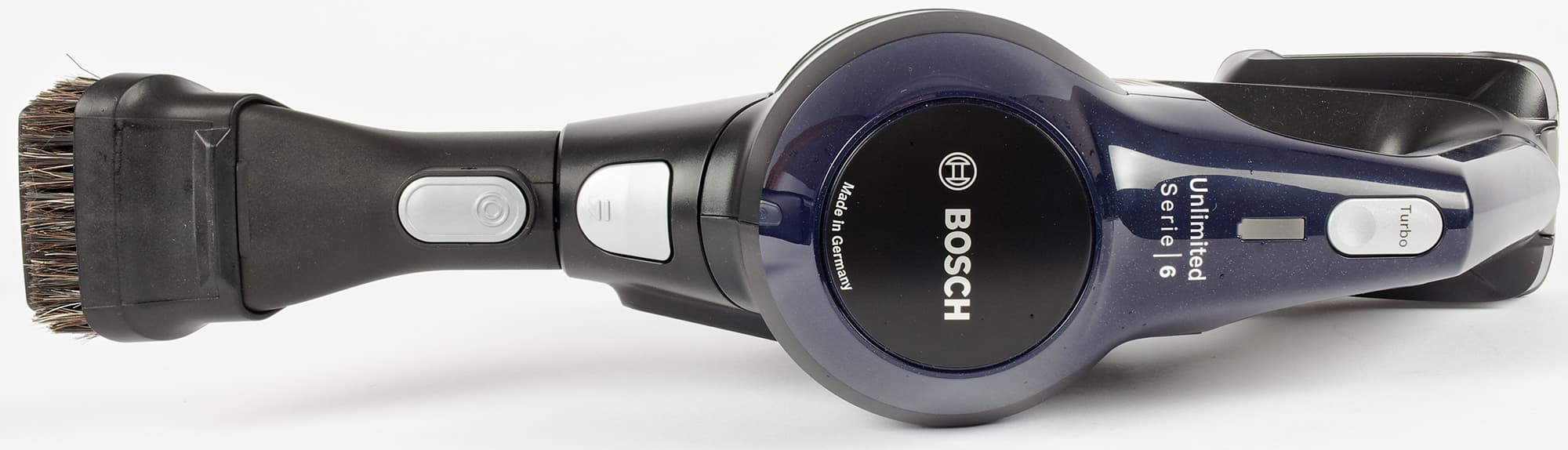Кнопка включения, расположенная внутри рукоятки, запускает мотор и фиксируется при нажатии — нет необходимости удерживать ее при работе. Второе нажатие выключает прибор. Клавиша Turbo на верхней панели включает режим повышенной мощности всасывания.