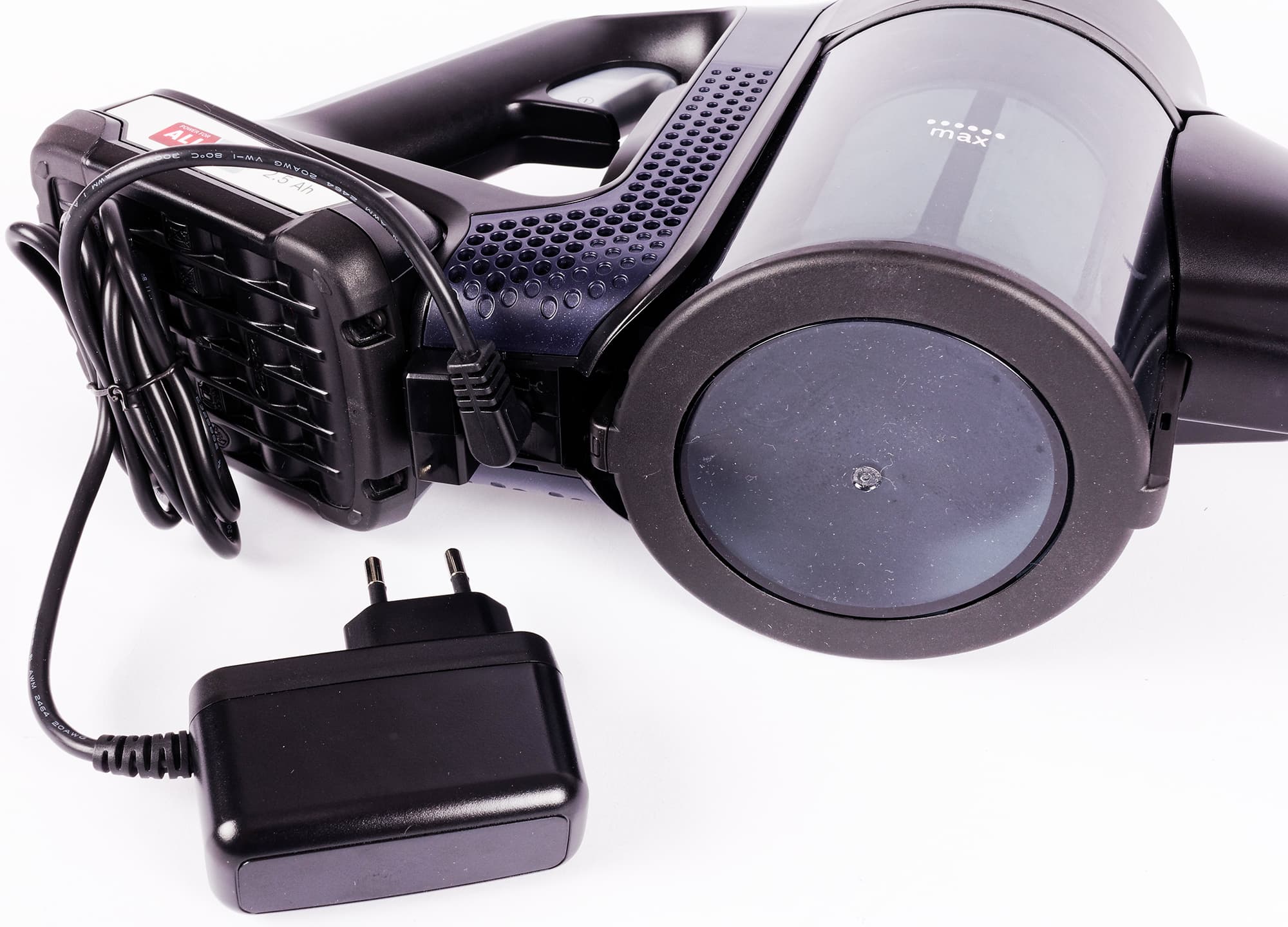 Гнездо для подключения питания расположено рядом с разъемом аккумулятора, в нижней части корпуса. Заряжать пылесос можно непосредственно от адаптера или через настенную базу.