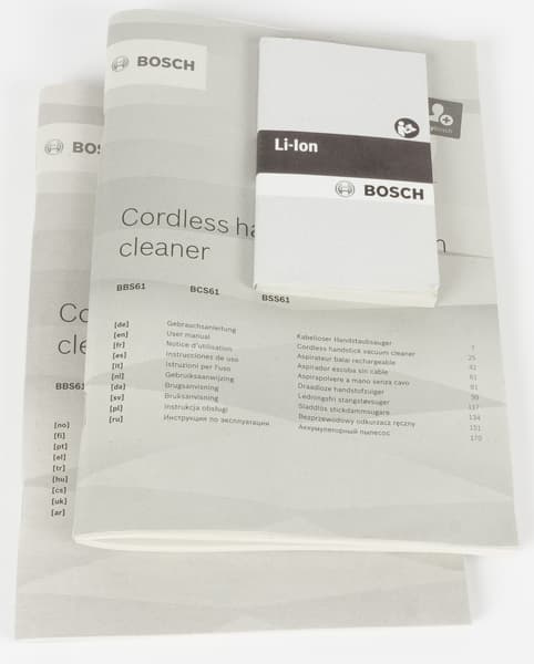 Bosch BCS611P4A упакован в глянцевую белую картонную коробку с полноцветной печатью. На ее лицевой стороне мы видим фотографию устройства «в полный рост», рядом с которой размещены изображения всего спектра аккумуляторной техники Power for All 18V — шуруповертов, дрелей, шлифовальных машин, садовых триммеров и многого другого. Возможность использовать общий формат аккумуляторов для множества устройств производитель справедливо считает одним из главных достоинств продукта. На лицевой стороне можно видеть также информацию о продолжительности работы (до 30 минут) и флаг страны-производителя: наш пылесос сделан в Германии.