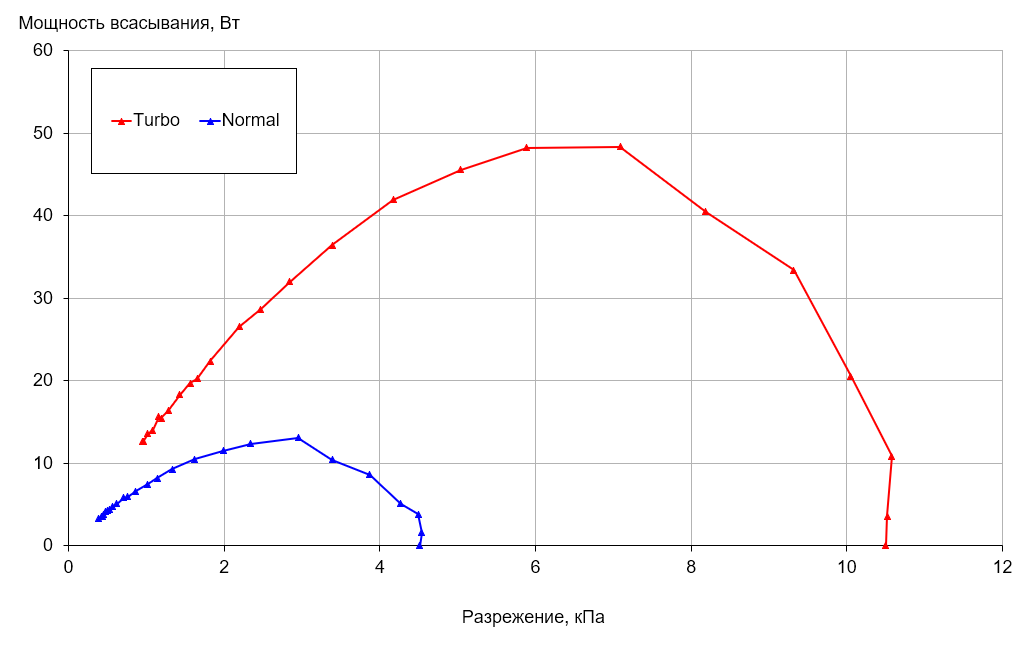 Мощность всасывания (что это такое и как мы ее измеряем, описано в отдельной статье) мы определяли при работе пылесоса без трубы и насадок, в обоих режимах. Зависимость мощности всасывания от создаваемого разрежения приведена на графике ниже: