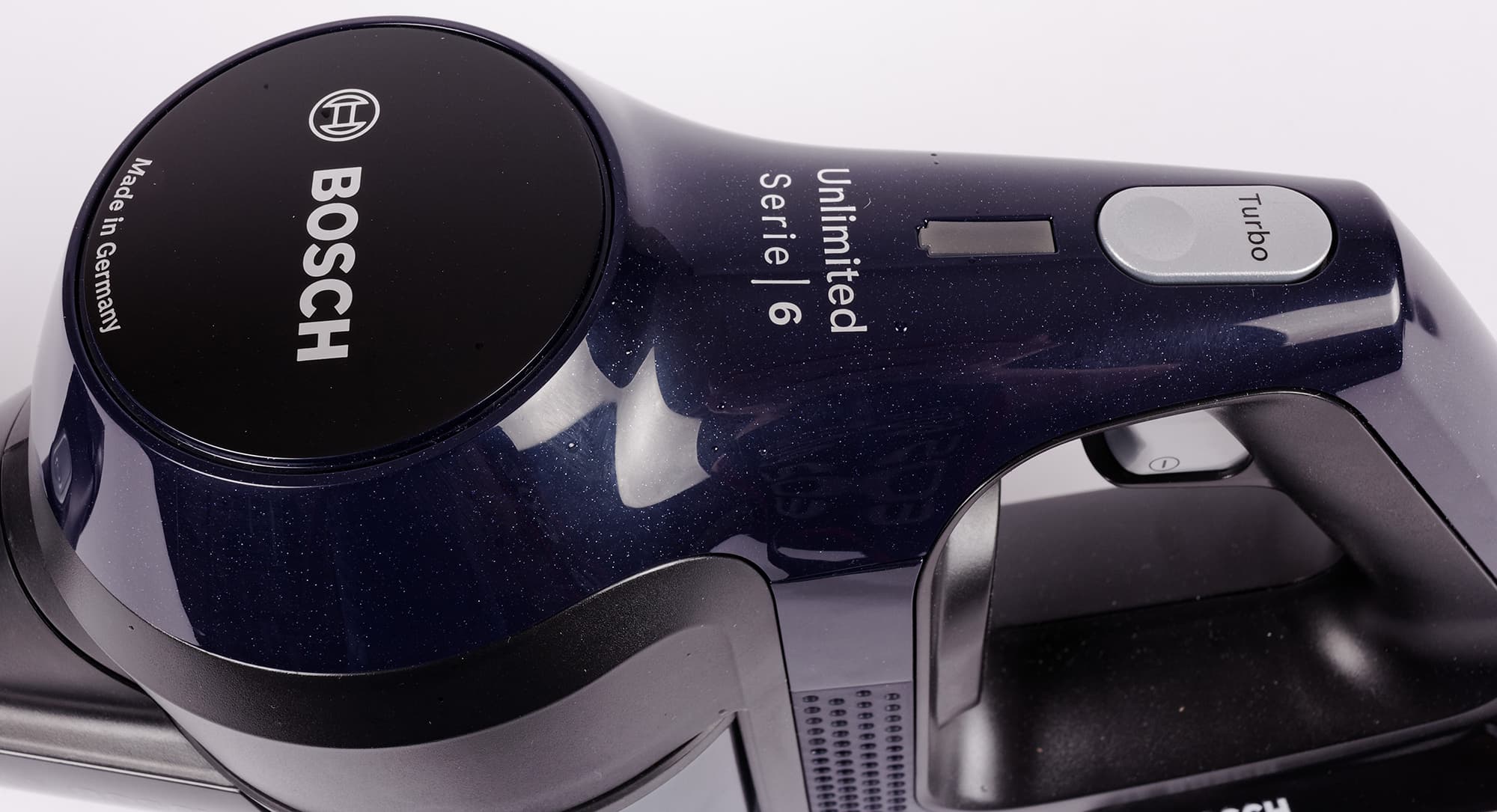 На верхней панели размещены логотипы производителя и серии бытовой техники — Unlimited Serie | 6. Кнопка включения турбо-режима расположена так, что ее удобно нажимать большим пальцем любой руки — устройство может с одинаковым удобством использовать и правша, и левша. В передней части корпуса есть светло-серая клавиша защелки, фиксирующая мусоросборник.
