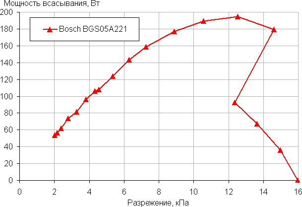 Инструментальные тесты в основном заключались в определении мощности всасывания и измерении уровня шума. Зависимость мощности (что это такое и как мы ее измеряем описано в отдельной статье) всасывания от создаваемого разрежения приведена на графике ниже: