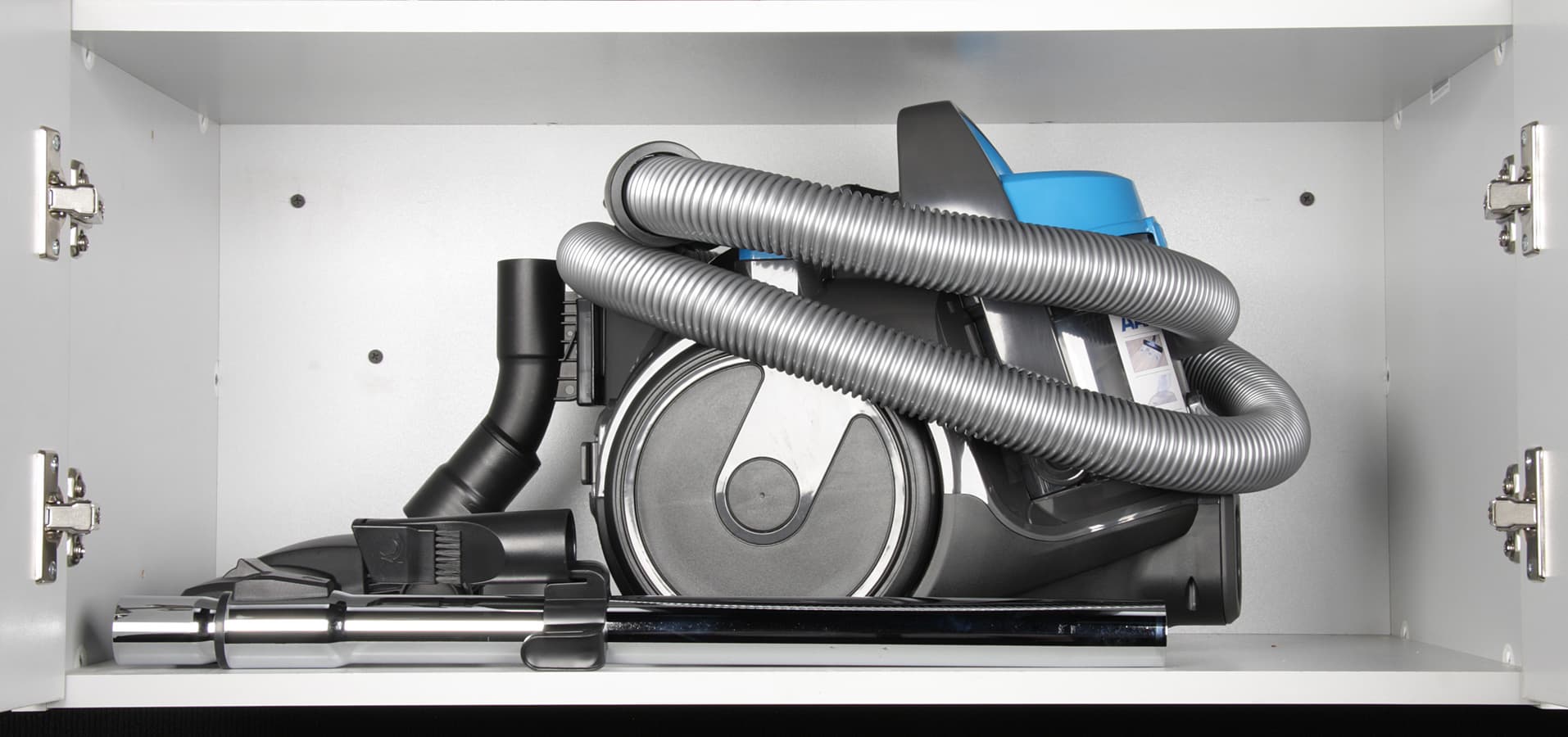 Для хранения пылесоса в компактном виде шланг можно обмотать вокруг корпуса и зафиксировать с помощью указанного держателя. В таком виде пылесос помещается на полке с типичной глубиной и высотой. Например, на фотографии ниже пылесос со всеми принадлежностями умещается на полке длиной 75 см, глубиной 36 см и высотой 32,5, при этом дверцы плотно закрываются (чуть поджимая шланг) и на полке еще есть свободное место.