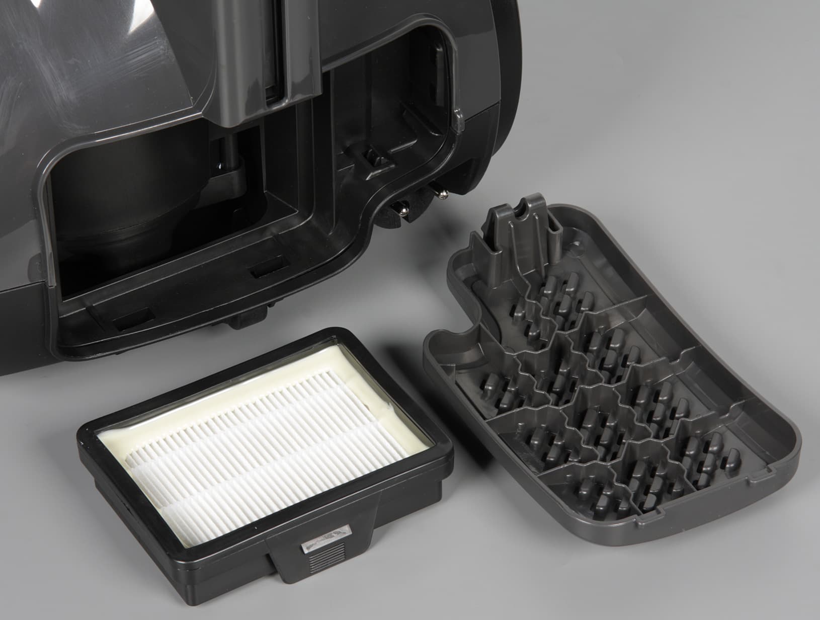 Система фильтрации трехступенчатая. На первой ступени циклон отделяет крупный мусор, на второй ступени самая мелкая пыль задерживается предмоторным фильтром, а финальную очистку воздуха выполняет выпускной фильтр EPA E12. Стыки деталей на пути прохождения воздушного потока, там, где это нужно, оснащены упругими прокладками, обеспечивающими герметичность соединений.