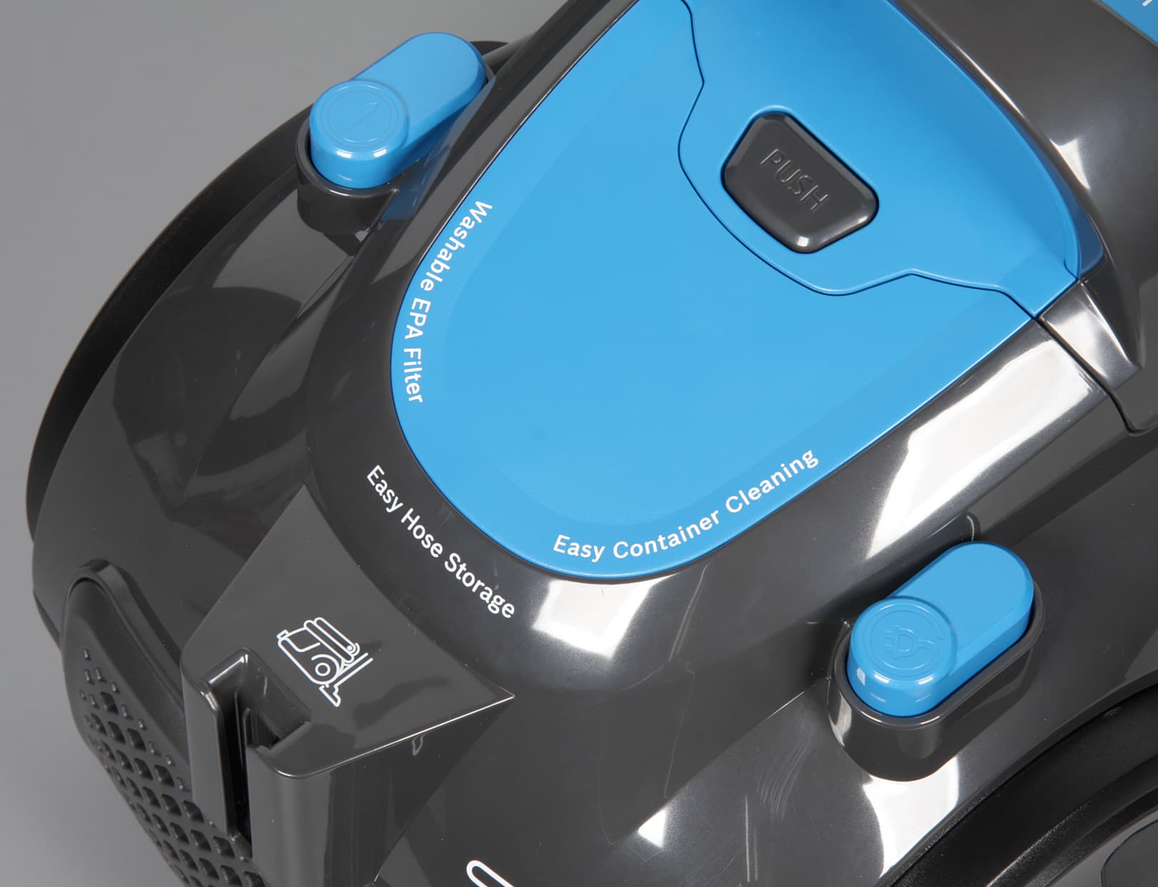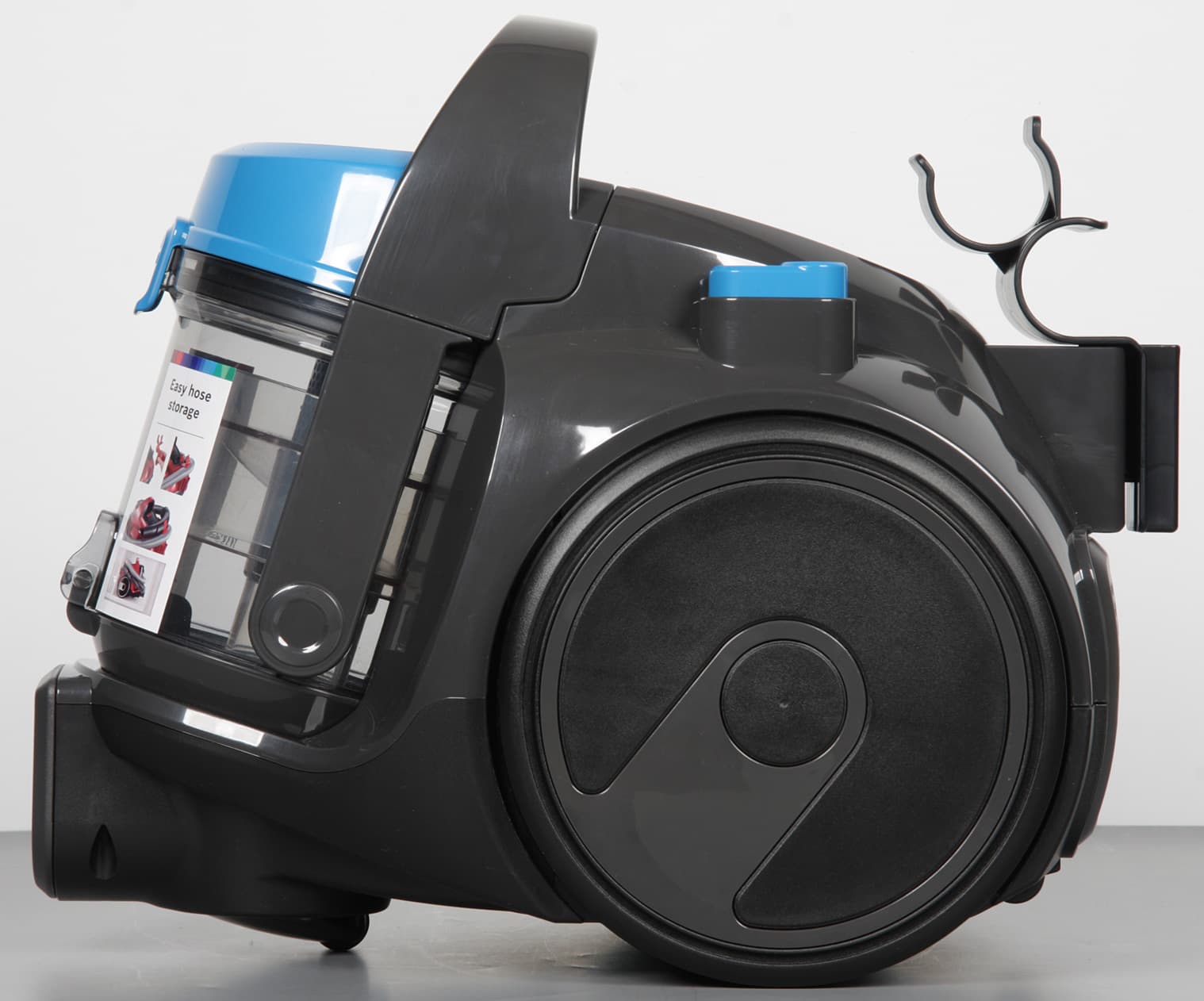 В сугубо практичный дизайн вносят разнообразие яркие детали цвета морской волны. Корпус пылесоса и аксессуары изготовлены в основном из пластика (ABS) без покрытия с матовой или зеркально-гладкой поверхностью. Большие (диаметр 180 мм) колеса просто пластиковые, без покрышек. Передний ролик на поворотной платформе и задний вспомогательный имеют покрышки из упругого пластика. Контейнер для мусора изготовлен из прозрачного слегка тонированного пластика.
