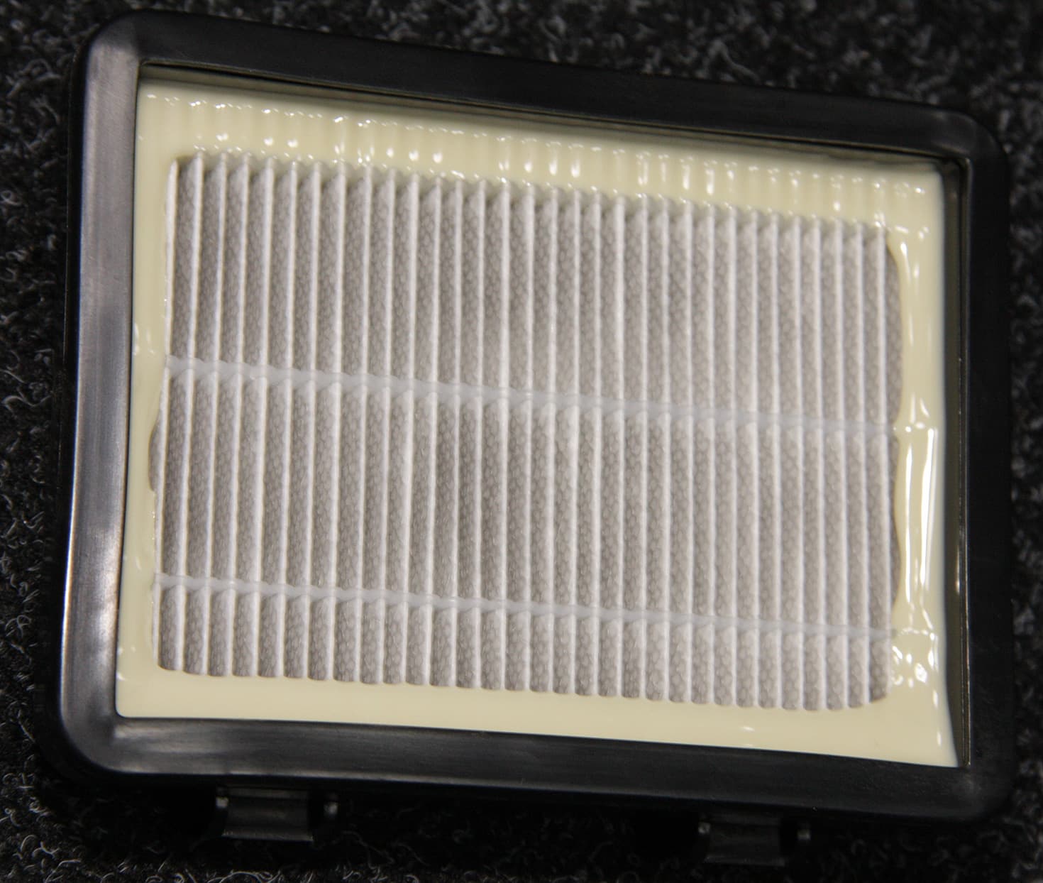 Затем из крышки вынимается предмоторный фильтр, состоящий из вкладки из плотного поролона и складчатого фильтра EPA E10. Эти фильтрующие элементы выколачиваются, а при необходимости промываются водой.