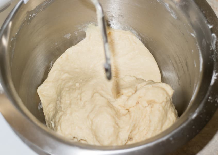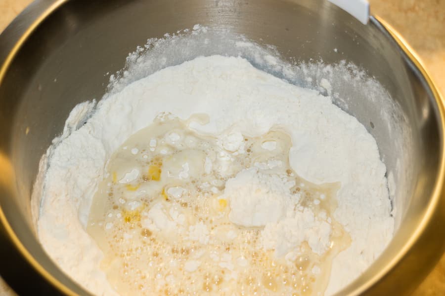 Подогрели молоко и размешали в нем дрожжи — использовали живые дрожжи из расчета утроенного количества сухих. В месильную чашу насыпали муку, соль, сахар, сделали углубление, в которое вылили молочную смесь.