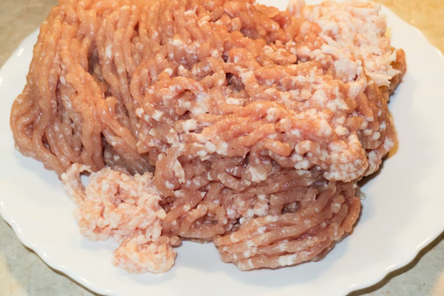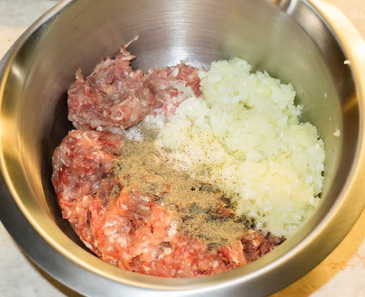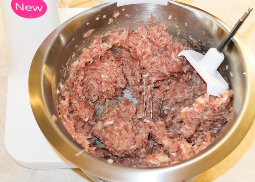 Пока тесто, положенное в полиэтиленовый пакет, «отдыхало», мы занялись фаршем. Выложили в чашу миксера свиной и говяжий фарш, приготовленные ранее, добавили измельченный лук, соль и черный молотый перец.