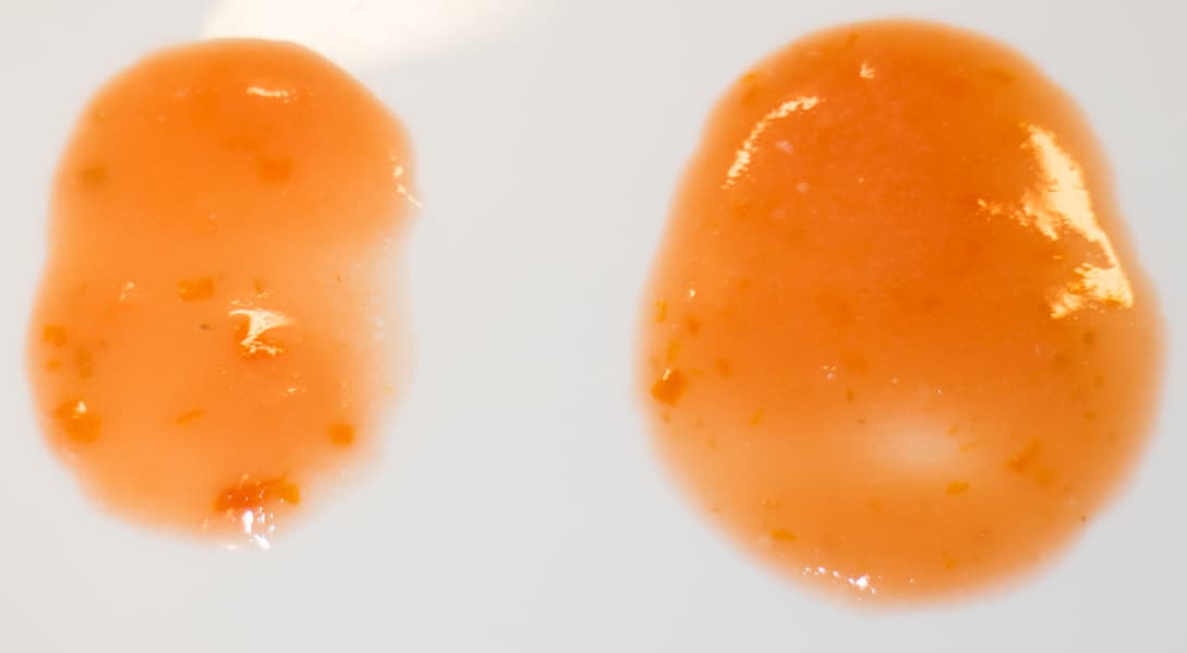 Уже через семь секунд работы на третьей скорости кусочки томатов были превращены в жидкую массу. Увеличили скорость до четвертой. Через 30 секунд остановили работу и оценили результат. Масса хорошо измельчена, однородна, но в ней встречаются кусочки шкурки и целые косточки. Продолжили измельчение. Еще через 30 секунд остановили и опять посмотрели на результат: масса стала пышнее, кусочки шкурки мельче, косточки неразличимы (на фотографии справа).