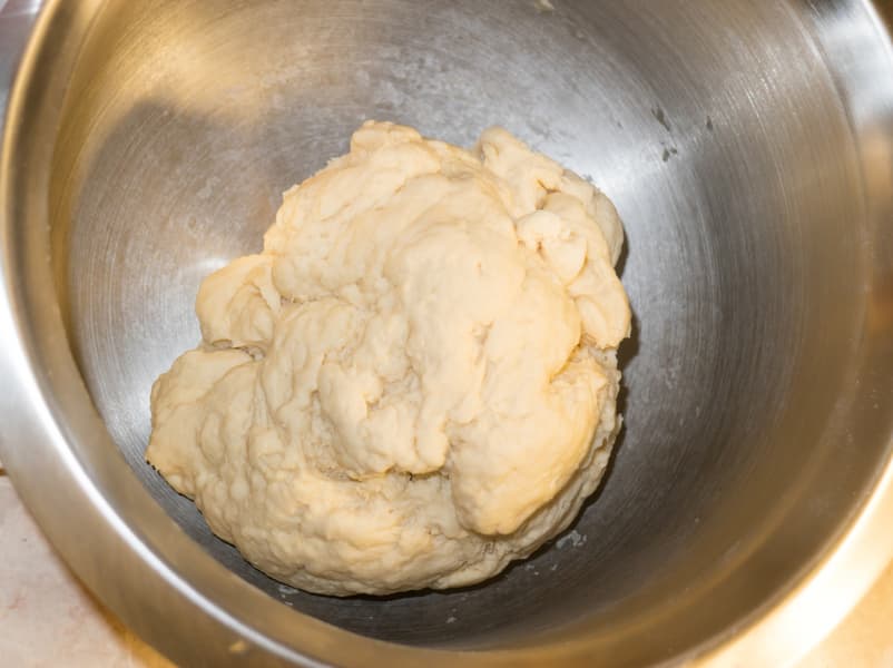 Тесто достигло нужного нам состояния через пять минут. Ком гладкий, мягкий, не липнет к рукам и каким-либо поверхностям — очень мягкая и нежная консистенция. Накрыли чашу пленкой, поставили тесто на расстойку в духовку и принялись за приготовление начинки.