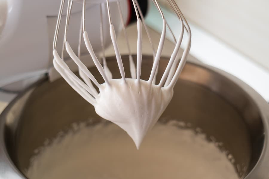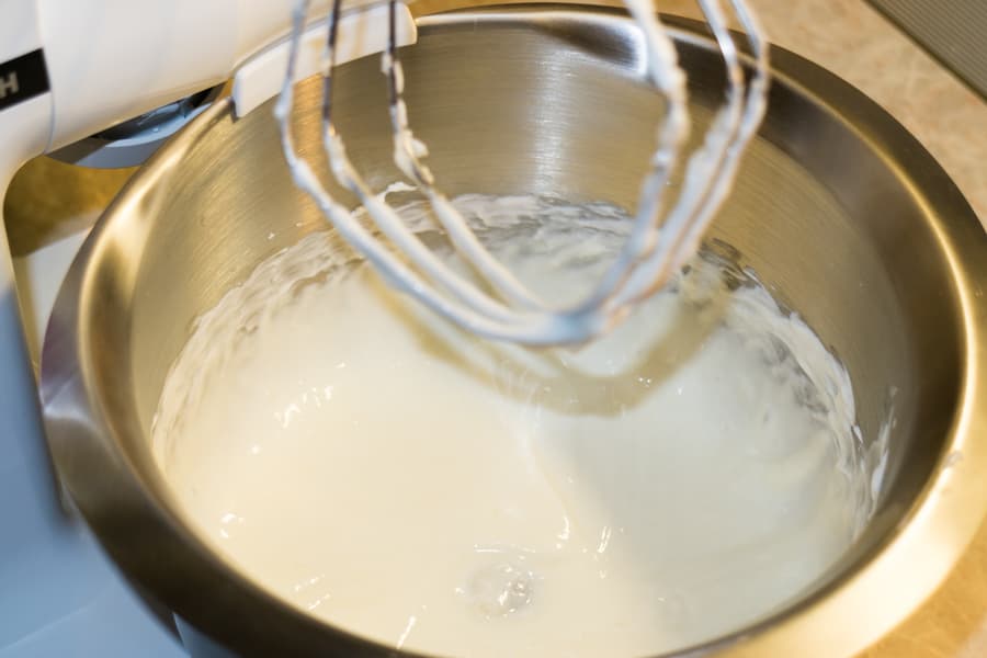 Через пять минут с начала взбивания остановили — сливки были густые и пышные, но недостаточно крепко, как нам показалось, держали форму. Повзбивали еще минуту, после чего остановили процесс.