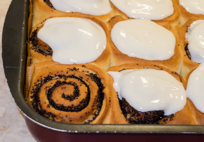 Горячие булочки обильно смазали глазурью. Через полчаса булочки можно было дегустировать.