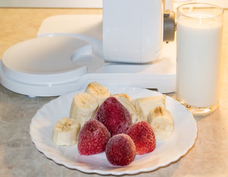 В инструкции указано, что с помощью блендера можно измельчать лед. Потребность в чистом молотом льде возникает не так часто, а вот что случится с замороженными ягодами, попавшими в коктейль, узнать довольно полезно. Мы взяли 90 г замороженной клубники, один банан и стакан молока.