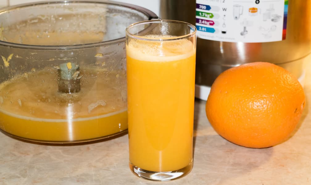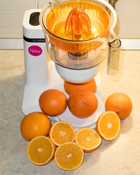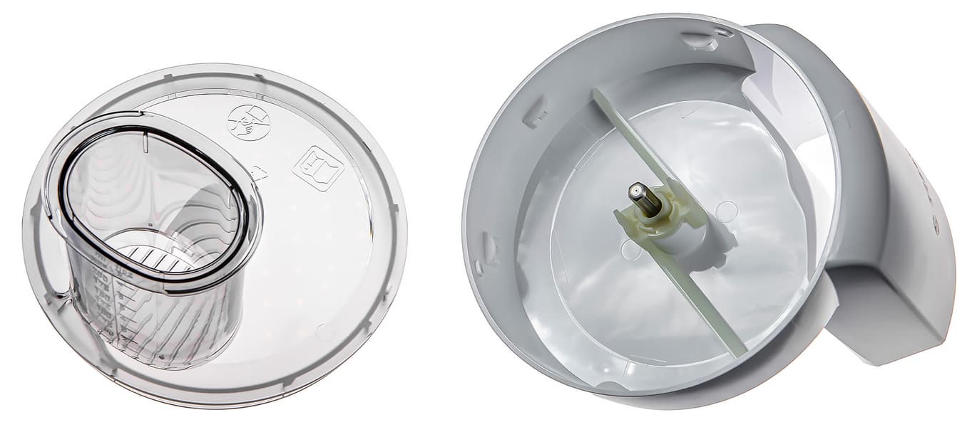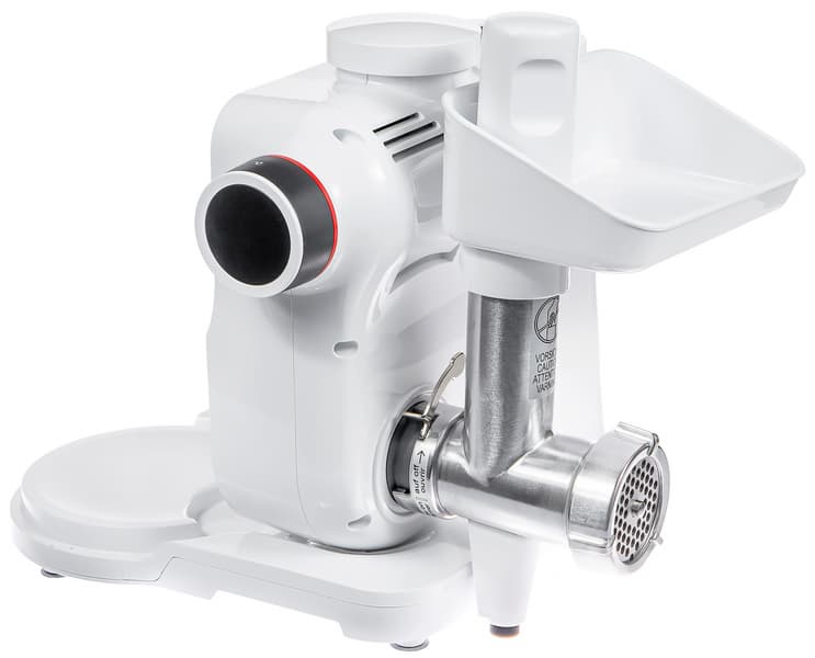 Из недостатков мы обратим внимание на одну особенность конструкции и один мелкий нюанс, выявленный при эксплуатации. Под мясорубку можно поставить емкость с высотой бортов не более 5,5 см. Однако во время тестов мы привычно использовали миску с высокими бортами: она просто не стояла прямо — один ее край был заведен за кольцевую гайку. При отжиме цитрусовых на максимальной скорости капли сока могут вылетать за пределы насадки.