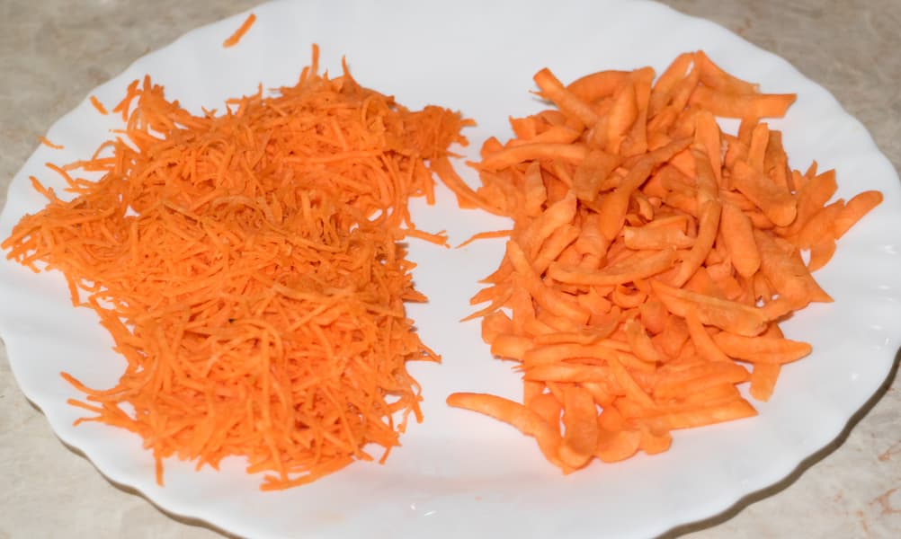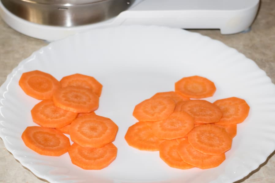 Все кусочки ровные, одинакового размера, отходов — недорезанных тонких ломтиков ровно столько, сколько морковок мы перетерли.