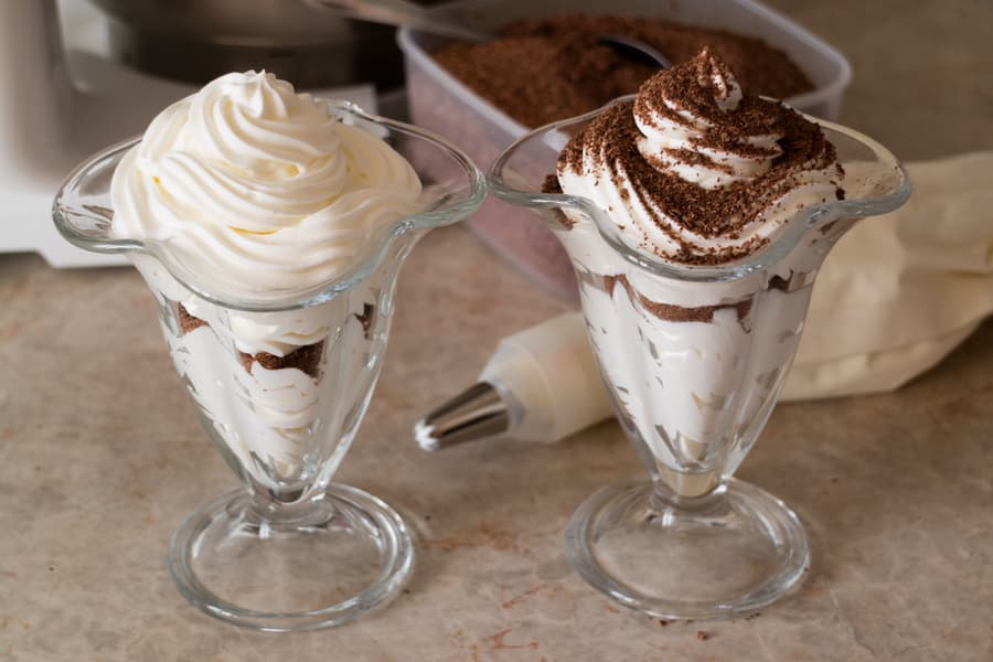 Переложили сливки в кондитерский мешок и отсадили в креманку, пересыпав натертым в предыдущем опыте шоколадом.