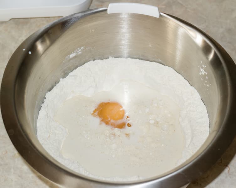 Вода + одно яйцо — 270 мл, водка — 1-1,5 ст. л., масло растительное — 1 ст. л., мука пшеничная в/с — 500 г.
