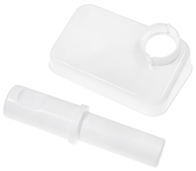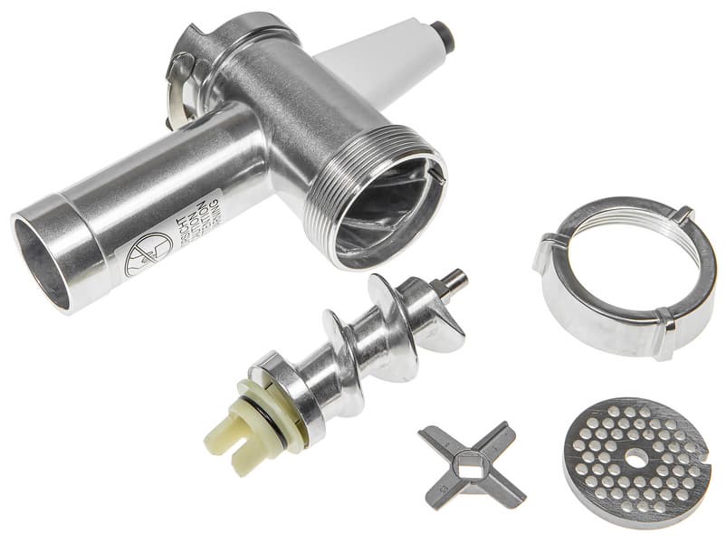 - насадку мясорубку в сборке — корпус, винтовая гайка, перфорированная решетка, нож, шнек и съемный пластиковый упор-ножка