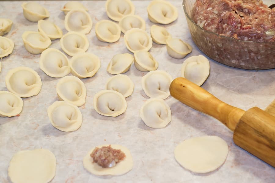 Пельмени (плотное пресное тесто и вымешивание фарша)