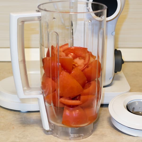 500 г томатов были нарезаны на крупные куски и помещены в кувшин. Никакой воды или иной жидкости в данном, обязательном для блендеров, тесте мы не добавляем.