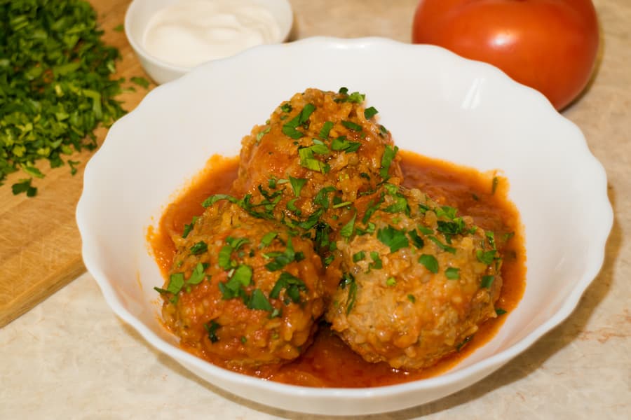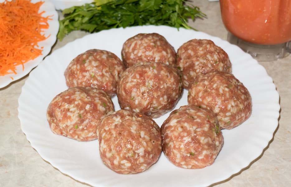 Взяли немного свиного и говяжьего фарша, приготовленного ранее, добавили предварительно замоченный рис, соль, специи, нарезанную петрушку и хорошо перемешали. Сформовали ежики.