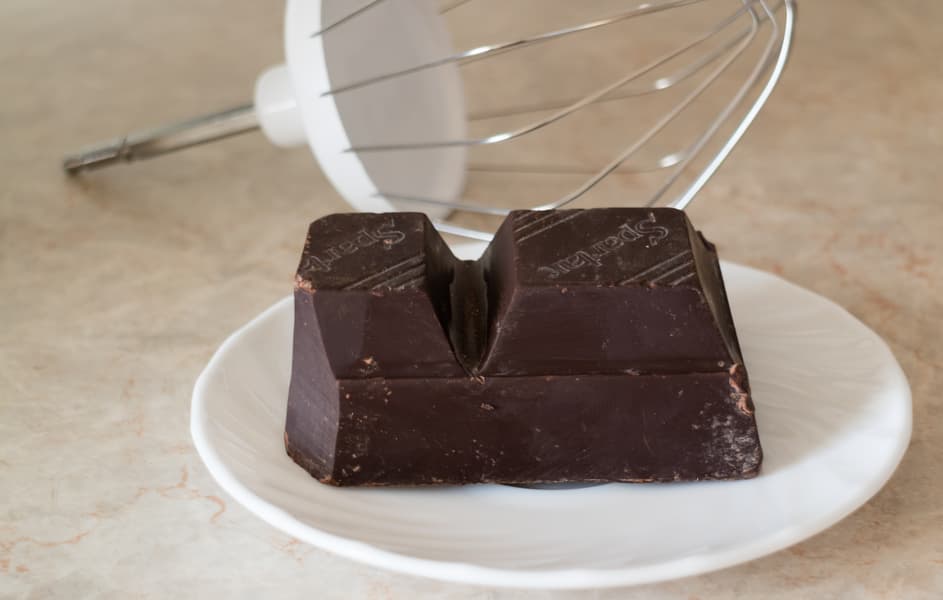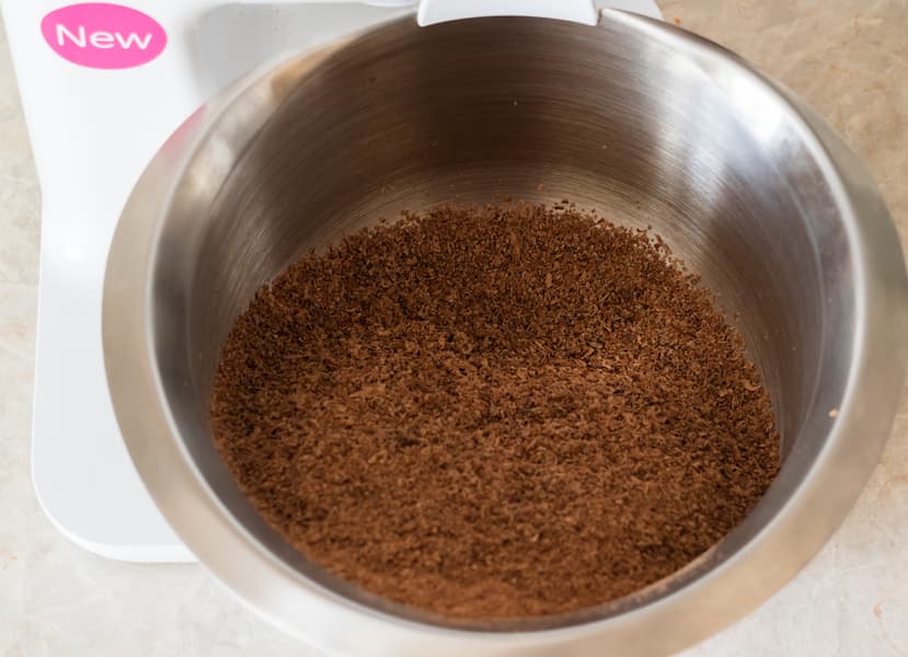 Остаток от килограммовой плитки горького шоколада весил 170 г. Шоколад чрезвычайно жесткий, натирать его вручную — тяжелый и неблагодарный труд, к тому же мелкой крошкой оказываются засыпаны все окружающие поверхности. Поэтому универсальная терка для выполнения такой задачи просто незаменима. Не сказать, что измельчение шоколада — ежедневное занятие, однако иметь в запасах граммов 100-200 шоколадной крошки можно — ей легко найти применение.