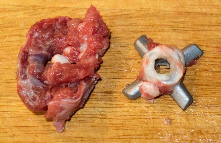 После разборки мясорубки мы обнаружили внутри малое количество не попавшего на ножи мяса и немного жилок, намотавшихся на шнек.